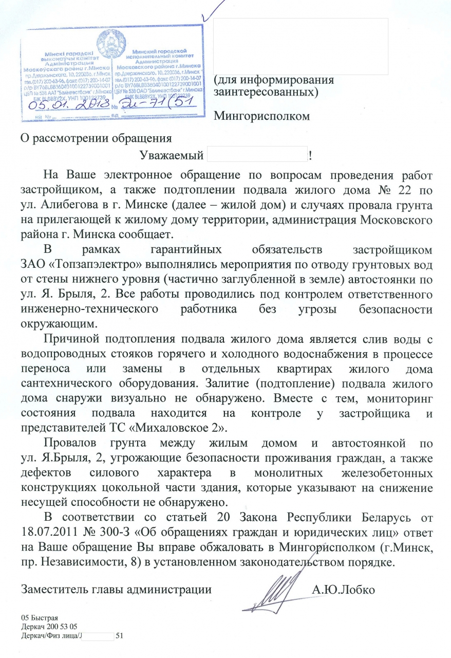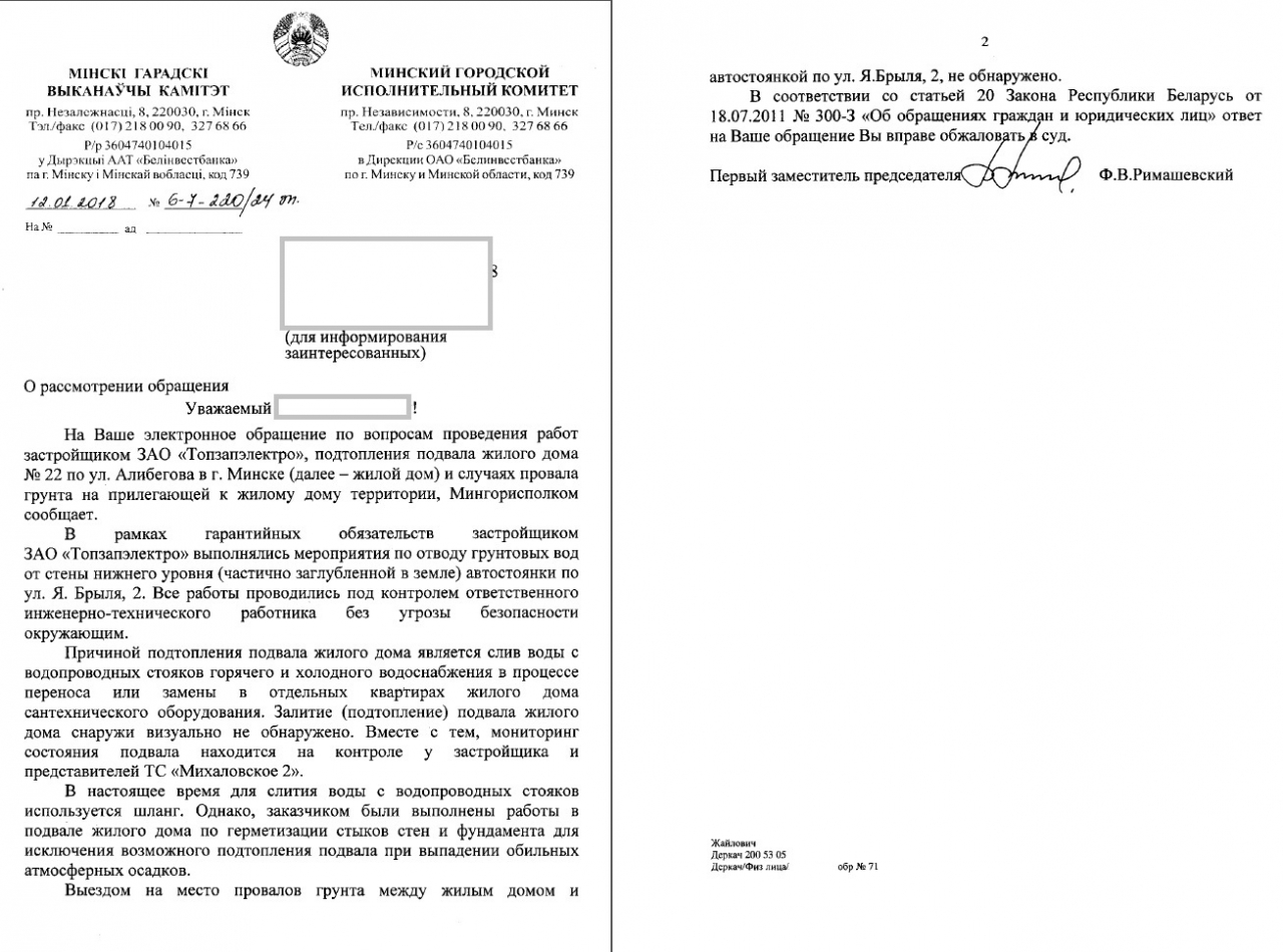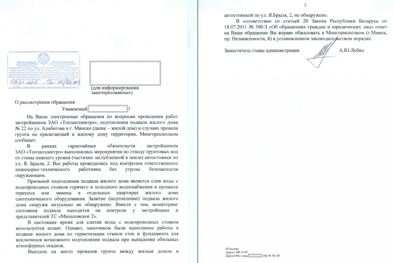 "Просим разъяснить, что за работы проводит застройщик ЗАО «Топзапэлектро» в непосредственной близости от жилого дома 22 по ул. Алибегова в г. Минске.