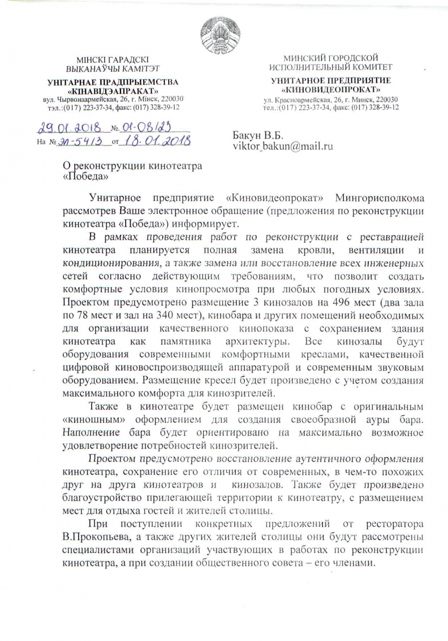 Хотелось бы подключиться и предложить Администрации района, проектировщику - творческая мастерская архитектора Бориса Костича «АР-ДИ » и РУП «Институт Белгоспроект» (архитектор Александр Нитиевский. ,УП Киновидеопрокат свои конструктивные идеи и предложения по поводу реконструкции и реставрации Кинотеатра Победа в Минске.