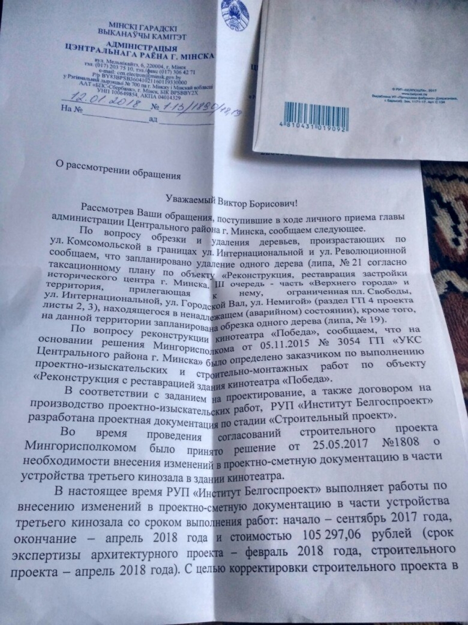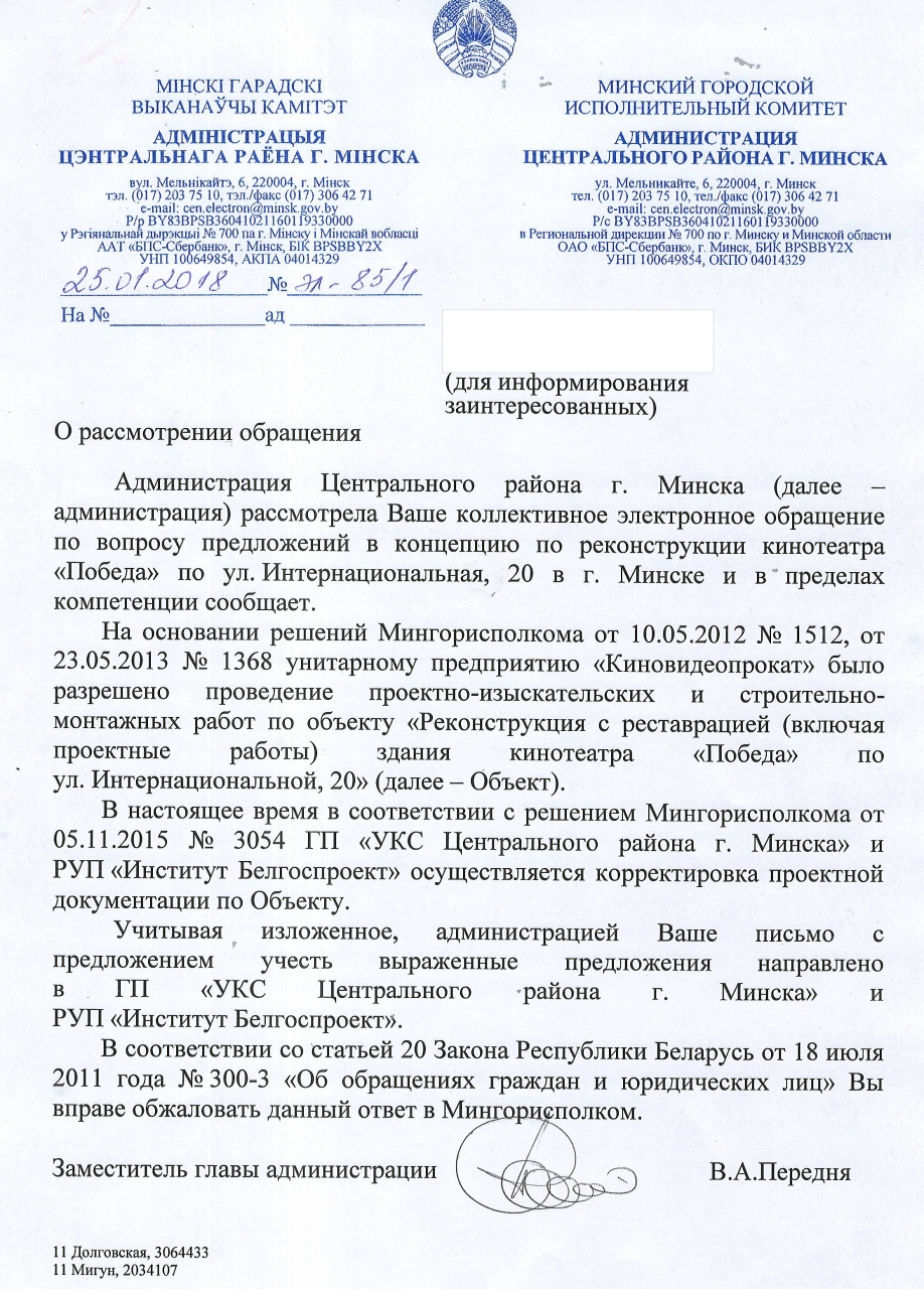 Поддерживаем Ваше предложение, которое было 16.09.2017 высказано во время прямой телефонной линии Администрации Центрального района и опубликовано на сайте Агентства "Минск – Новости" (https://minsknews.by/prostranstvo-vozle-kinoteatra-pobeda-hotyat-sdelat-bolee-prityagatelnyim-dlya-lyudey/ Пространство возле кинотеатра «Победа» хотят сделать более притягательным для людей), и просим принять во внимание при планировании работ мнение общественности, изложенное ниже.