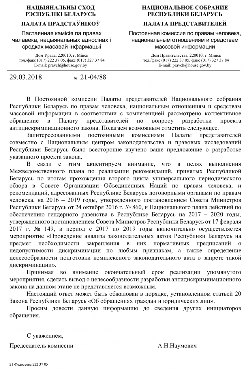 В период с 2017 по 2019 годы включительно осуществляется мероприятие «Проведение анализа законодательных актов Республики Беларусь на предмет необходимости закрепления в них нормативных предписаний о недопустимости дискриминации по любым признакам, а также определение целесообразности подготовки комплексного законодательного акта о запрете такой дискриминации».