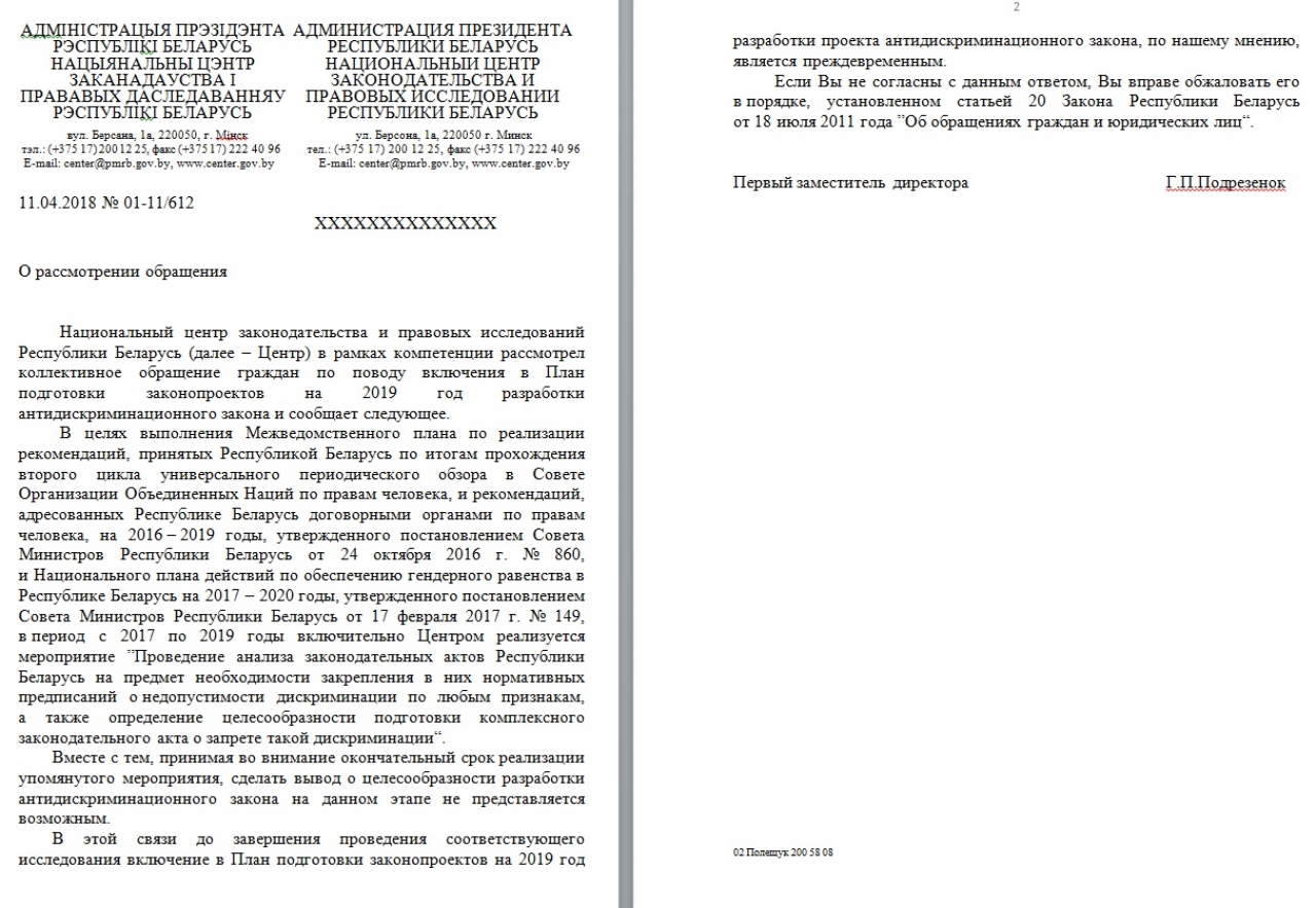 Центром реализуется мероприятие ”Проведение анализа законодательных актов Республики Беларусь на предмет необходимости закрепления в них нормативных предписаний о недопустимости дискриминации по любым признакам, а также определение целесообразности подготовки комплексного законодательного акта о запрете такой дискриминации“.