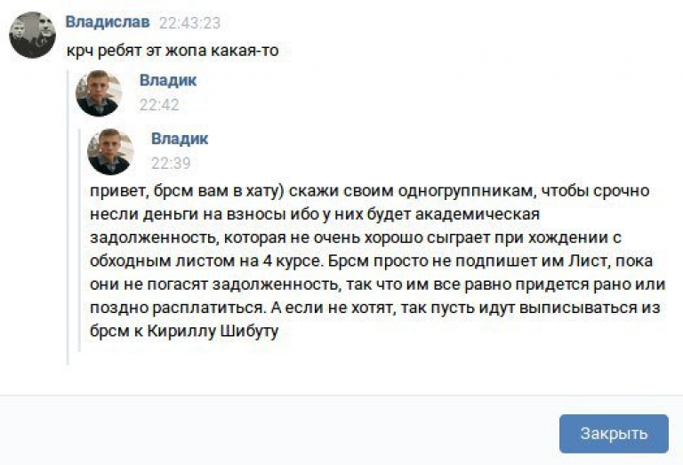 Пірожык Уладзіслаў, студэнт першага курса гістарычнага факультэта БДУ, актывіст БРСМ, 20 снежня 2017 пагражаў студэнтам акадэмічнай запазычанасцю за запазычанасць грашовую перад БРСМ і пагражаў што тым студэнтам ня будзе падпісаны некі не прадугледжаны законам абыходны ліст (глядзець дадатак)