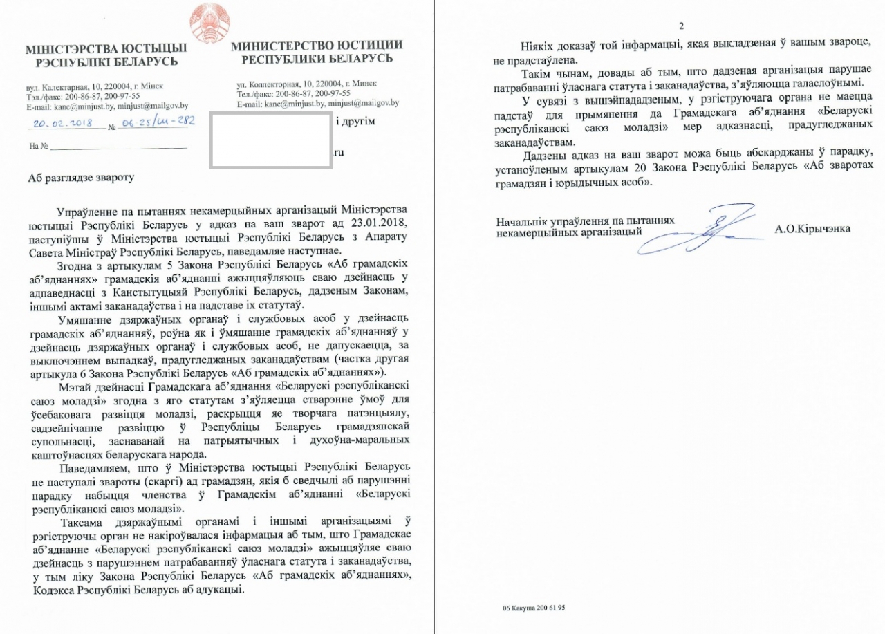 2) Вынесці грамадскаму аб’яднанню «Беларускі рэспубліканскі саюз моладзі» афіцыйнае папярэджанне аб недапушчэнні вышэйпададзеных парушэнняў, а таксама зрабіць усё магчымае для спынення парушэнняў у далейшым;