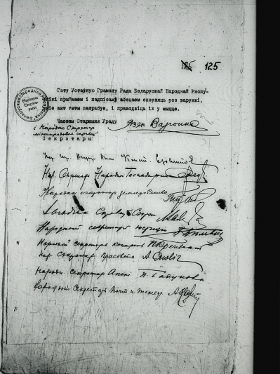 Згодна п. 4 артыкула 27 Закона Рэспублікі Беларусь ад 25 лістапада 2011 «Аб архіўнай справе і справодстве ў Рэспубліцы Беларусь» у мэтах задавальнення патрэб грамадзян, грамадства і дзяржавы ў выкарыстанні інфармацыі, якая змяшчаецца ў архіўных дакументах, ажыццяўляецца папулярызацыя архіўных дакументаў. У фондзе №325 («Рада министров БНР») Нацыянальнага архіва Рэспубліка Беларусь знаходзіцца ўнікальны дакумент — Трэцяя ўстаўная грамата ад 25 сакавіка 1918 года, паводле якой абвяшчалася незалежнасць Беларускай народнай рэспублікі (БНР). Грамата падпісана: Часовым старшынёй урада і народным сакратаром замежных спраў Язэпам Варонкам, народным сакратаром ваенных спраў Канстанцінам Езавітавым, народным сакратаром народнай гаспадаркі Янам Серадой, народным сакратаром землярбства Тамашам Грыбам, народным сакратаром юстыцыі Яфімам Бялевічам, загадычкам спраў сэкрэтарыяту Лявонам Зайцам, народным сакратаром кантроля Пятром Крачэўскім, народным сакратаром асветы Акрадзем Смолічам, народным сакратаром апёкі Палутай Бадуновай, народным сакратаром поштаў і тэлеграфаў Аляксандрам Карабачам.