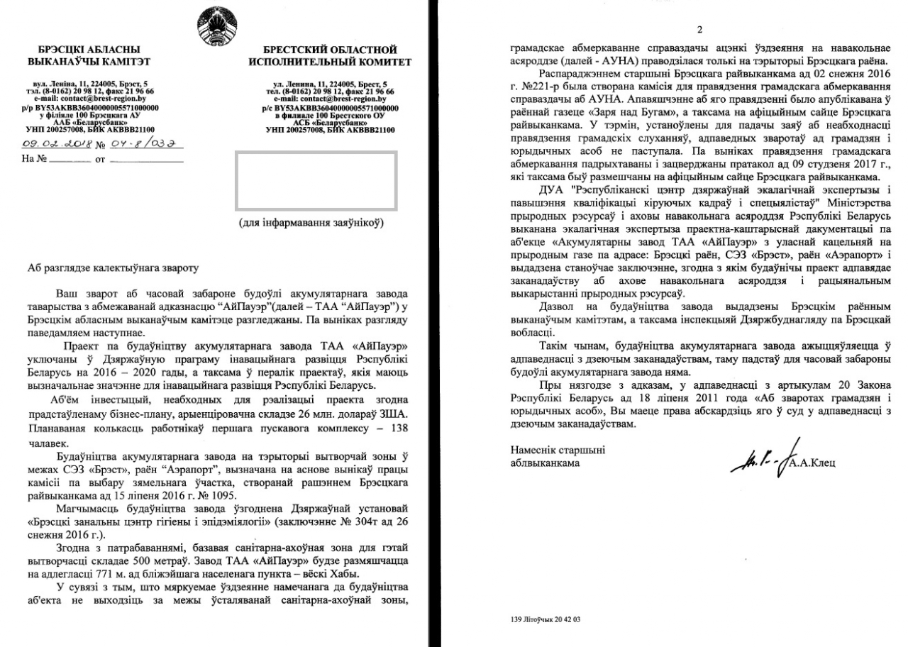 У звязку з гэтым уяўляецца патрэбным прынамсi часова забаранiць будоўлю акумулятарнага заводу для правядзення грамадзкiх слуханняў i экалягiчных экспертыз бяспекi дзейнасцi дадзенага заводу для прыроды i здароўя людзей. Менавiта меркаванне народу мусiць быць вырашальным пры прыняццi рашэння адносна лёсу заводу, i нiякiя карыслiвыя iнтарэсы асобных людзей не павiнны на гэта ўплываць.