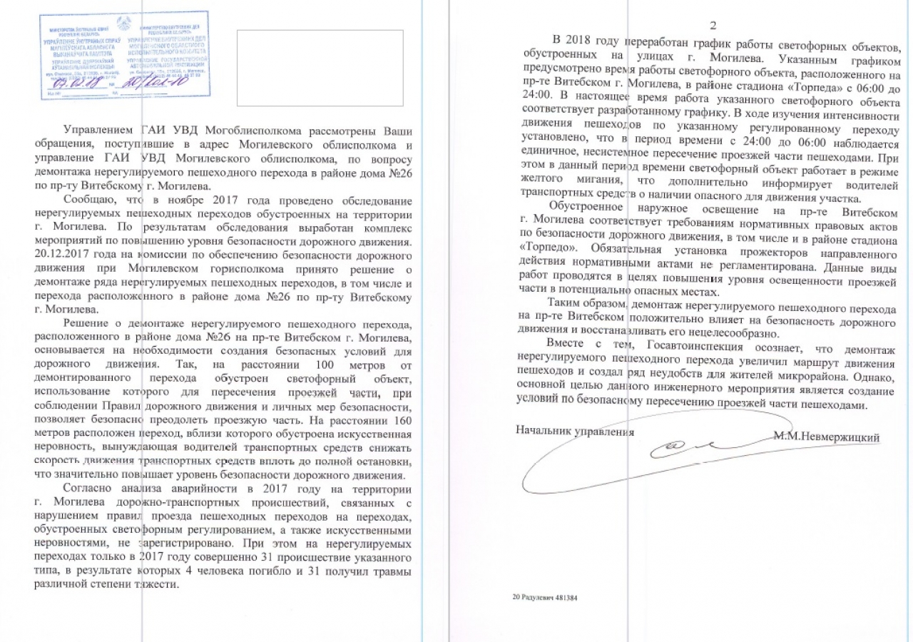 Насколько известно жителям завода Кирова, на закрытом пешеходном переходе в последние годы не было ДТП с участием пешеходов. Данный пешеходный переход не является опасным. Согласно пункту 6.1 ПДД Республики Беларусь «Участники дорожного движения имеют право на обеспечение безопасных и эффективных условий дорожного движения». С закрытием пешеходного перехода у пешеходов на данном участке Витебского проспекта ухудшаются условия при пересечении проезжей части. Поэтому считаем, что решение об упразднении перехода было преждевременным и не учитывающим все обстоятельства и интересы многих людей.