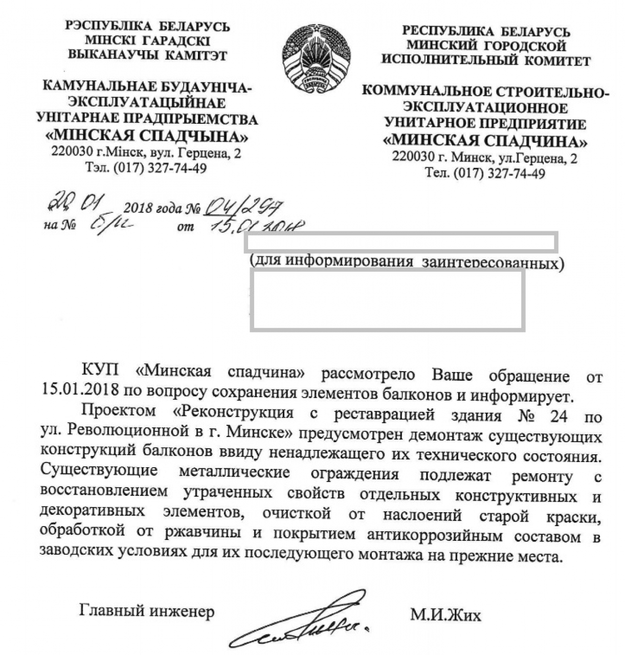 Прошу разобраться, почему в отведенный законодательствам срок (1 месяц) КУП "Минская спадчина" проигнорировало обращение, направленное 06.12.2017. В пределах Вашей компетенции прошу разобраться в соответствии с Законом об обращениях граждан и юридических лиц - почему ответственные лица КУП Минской спадчина - не считают нужным выполнять Закон об обращениях граждан, Также данный факт о отсутствии ответа по ситуации с исчезновение балконов на Революционyjой 24 в период реконструкции изложен одним из пунктов в обращении и во время личного приёма с Римашевским Ф.В.Ф,В. Римашевским дано поручение П.П Шикунцу отчитаться по данной ситуации В соответствии с Закон об обращении граждан и юридических лиц прошу привлечь лиц ответственных за игнорирования обращения к с дисциплинарной и административной ответственности(в виде административного взыскания штрафа. Cчитаю закон одинаков для всех и должен исполняться всеми одинаково. О результатах проверки и мерах в отношении виновных лиц прошу сообщить письменно письмом на указанный адрес.Проинформировать меня как заявителя данного обращения