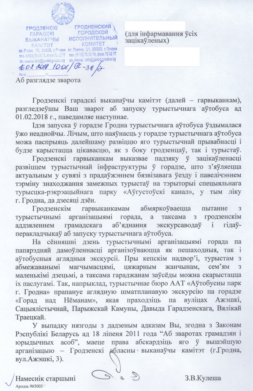 Прапануем запусціць у бязвізавым Гродне Hrodna City Tour Bus па прыкладу іншых турыстычных гарадоў (Мінск, Вільнюс, Санкт-Пецярбург). City Tour Bus дазволіць гораду прыняць больш турыстаў пры кепскім надвор'і (дождж, навальніца), турыстам з абмежаванымі магчымасцямі, цяжарным жанчынам, сем'ям з маленькімі дзяцьмі. Такі тур будзе цікавы і гарадзенцам, і жыхарам іншых гарадоў Беларусі. Прапануем падрыхтаваць відэагайд на пяці мовах (беларускай, рускай, ангельскай, польскай ды літоўскай), пры гэтым горад можа быць упэўнены ў якасці інфармацыйнага агляда гісторыі і сучаснага жыцця горада.
