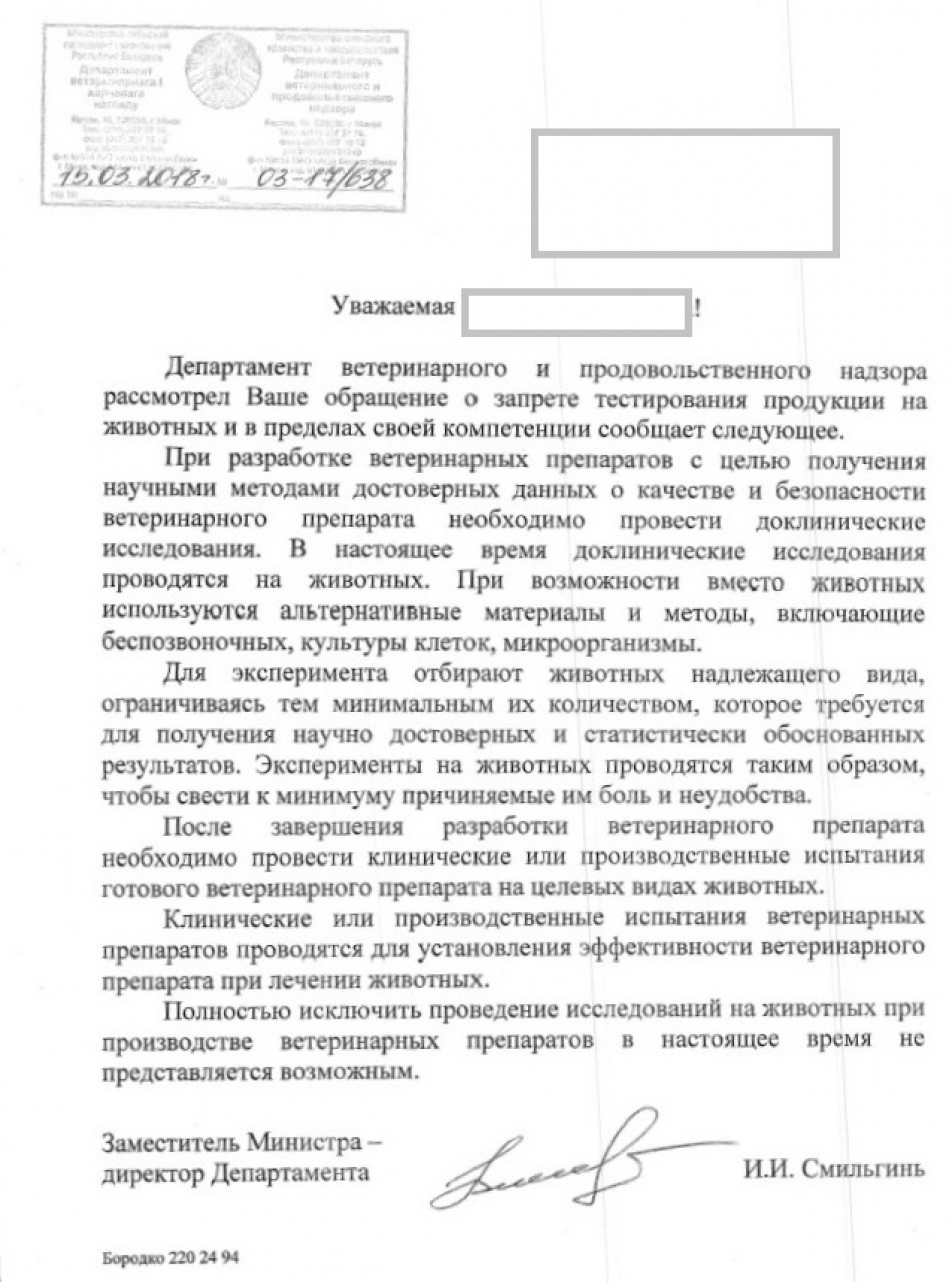 Несмотря на то, что в нашей стране разрешено не тестировать продукцию на животных, многие компании по производству парфюмерии, косметики, бытовой химии, фармацевтических препаратов и т.д. всё-таки тестируют свою продукцию и их компоненты на животных. Хотя другие страны пользуются альтернативными методами тестирования продукции и их компонентов без участия животных (из интернета - сегодня для тестирования все больше используются одноклеточные организмы, культуры клеток, тканей или органов. в то же время идет активная разработка методов компьютерного моделирования.). Если наша страна считает себя цивилизованной страной, необходимо принять закон о запрете тестировании любой продукции и их компонентов на животных и получение компаниями международных сертификатов в доказательство этому и сопутствующему нанесению этих сертификатов на свою продукцию, чтобы покупатели видели, что продукция не тестируется на животных.