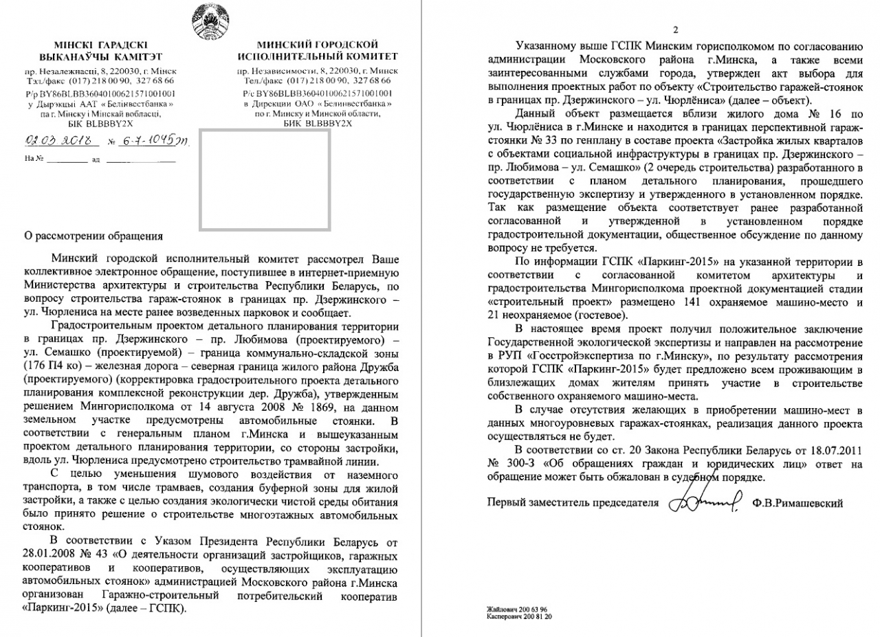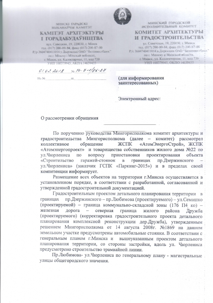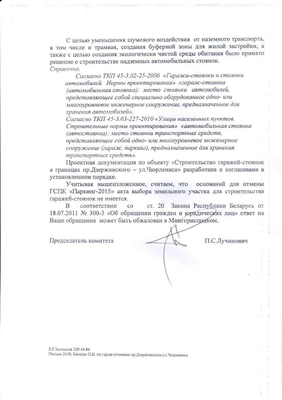 Учитывая изложенное, в связи с нарушением регламента вышеуказанной застройки просим произвести разбирательства по вопросу возможного строительства паркингов и приостановить ГСПК «Паркинг-2015» действие акта выбора места размещения объекта «Строительство гаражей-стоянок в границах пр.Дзержинского – ул.Чюрлениса».