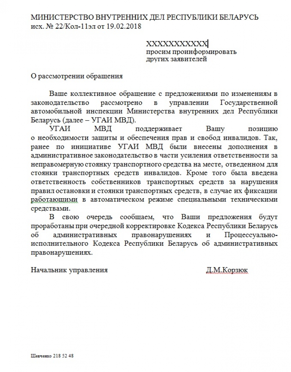 МВД поддерживает позицию о необходимости защиты и обеспечения прав и свобод инвалидов. Предложения будут проработаны при очередной корректировке Кодекса Республики Беларусь об административных правонарушениях и Процессуально-исполнительного Кодекса Республики Беларусь об административных правонарушениях.