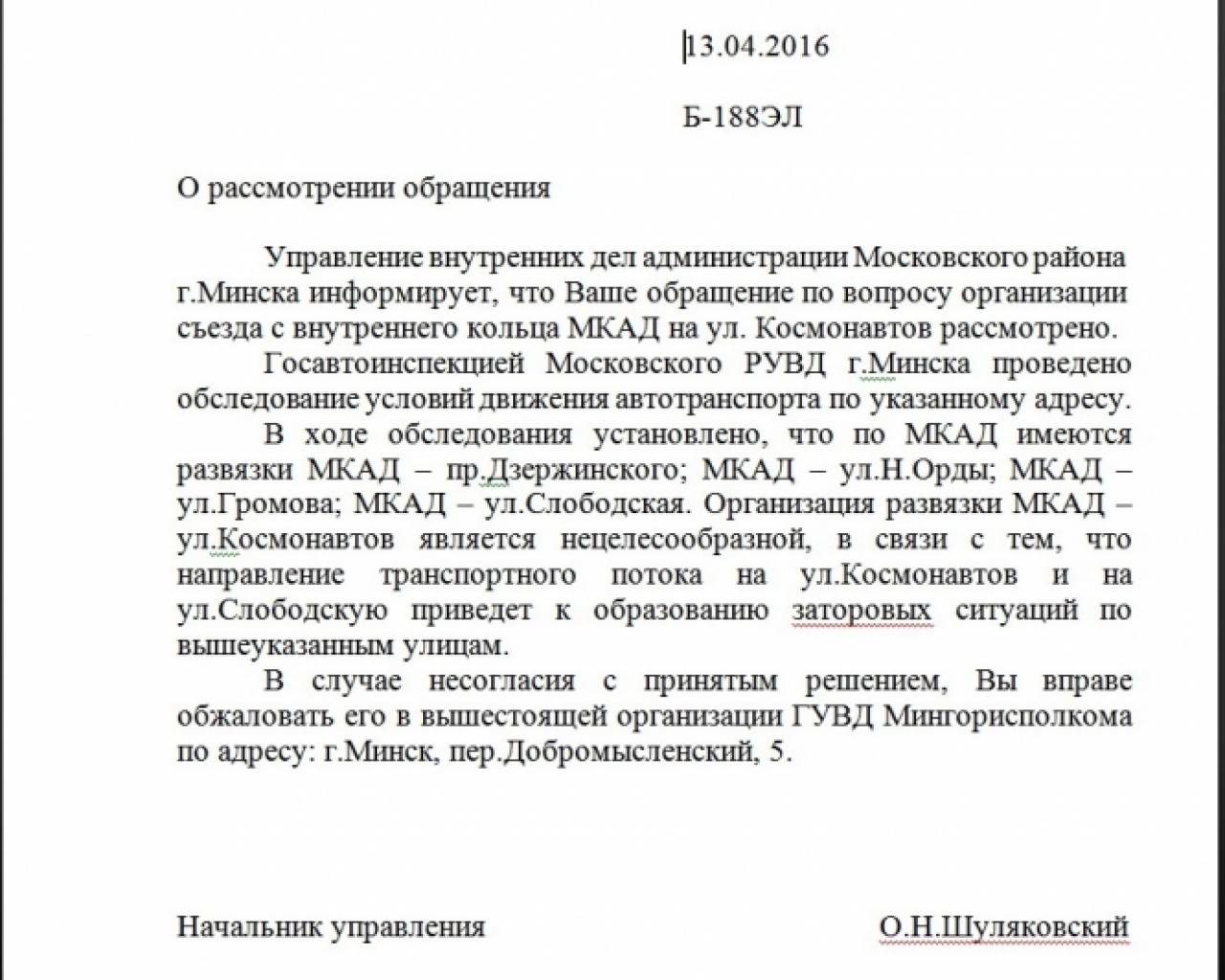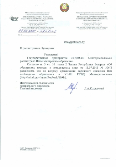 По результатам обследования ГАИ Московского района г. Минска полагает организацию развязки нецелесообразной, так как она приведет к возникновению заторов.