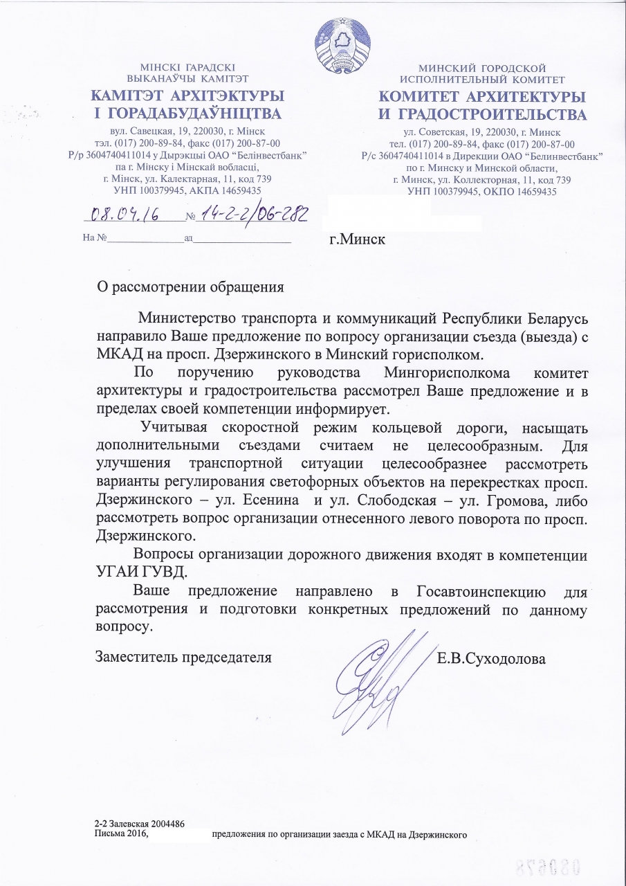 Хотим обратить Ваше внимание на сложившуюся тяжелую транспортную ситуацию и дальнейшее её ухудшение на пересечении пр-та Дзержинского с ул. Есенина и ул. Яна Чечота, а также пр-та Дзержинского и МКАД.