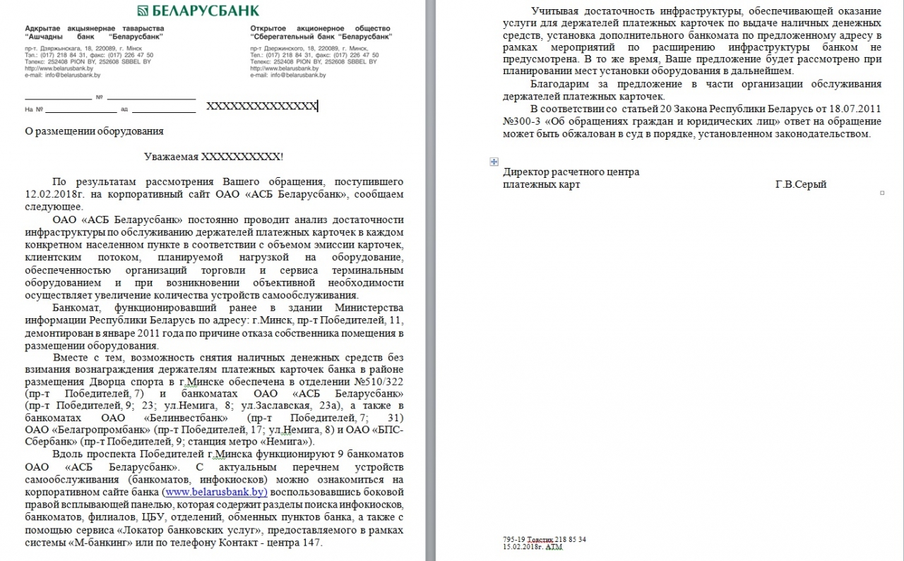 Просим вернуть банкомат в здание по адресу пр. Победителей, 11, а также, учитывая, что большинство государственных организаций сотрудничают с АСБ "Беларусьбанк", провести работу по расширению сети банкоматов в г.Минске.