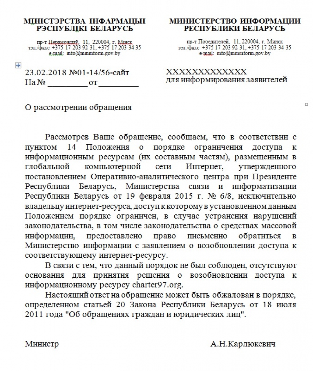 24 января 2018 года в Республике Беларусь решением министерства информации был заблокирован независимый сайт Хартия-97. Это напрямую нарушает конституционные права граждан на информацию. Можно по-разному относиться к материалам, публикуемым на Хартии-97. Однако несомненно то, что эти материалы в целом дают правдивую информацию, в первую очередь, о сложнейшем социально-экономическом положении страны и политической ситуации в ней. Силовая блокировка сайта неизбежно порождает вопросы об эффективности государственной идеологии и соответствующих структур, существующих на бюджетные средства.
