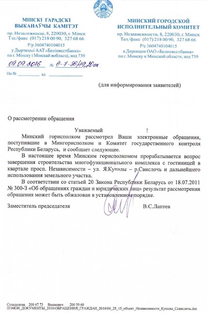 Учитывая сказанное председателем Мингорисполкома и мнение большинства минчан, мы требуем снести гостиницу возле цирка, а на освободившемся месте посадить деревья.