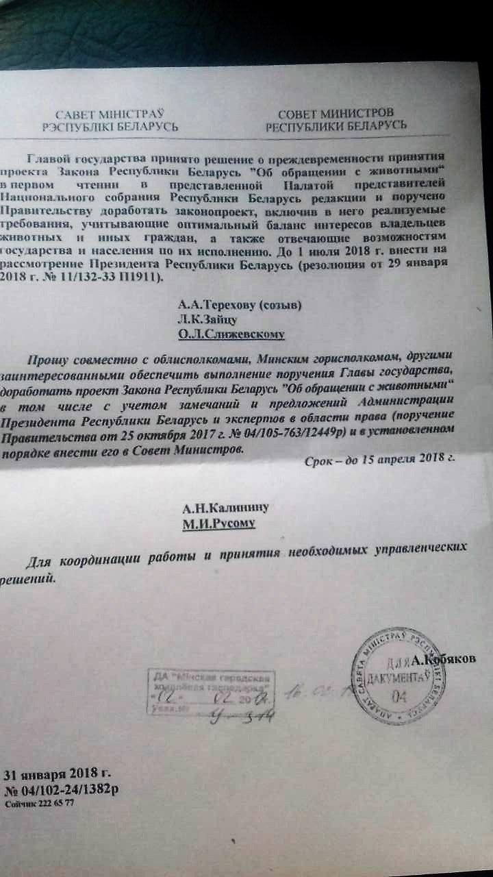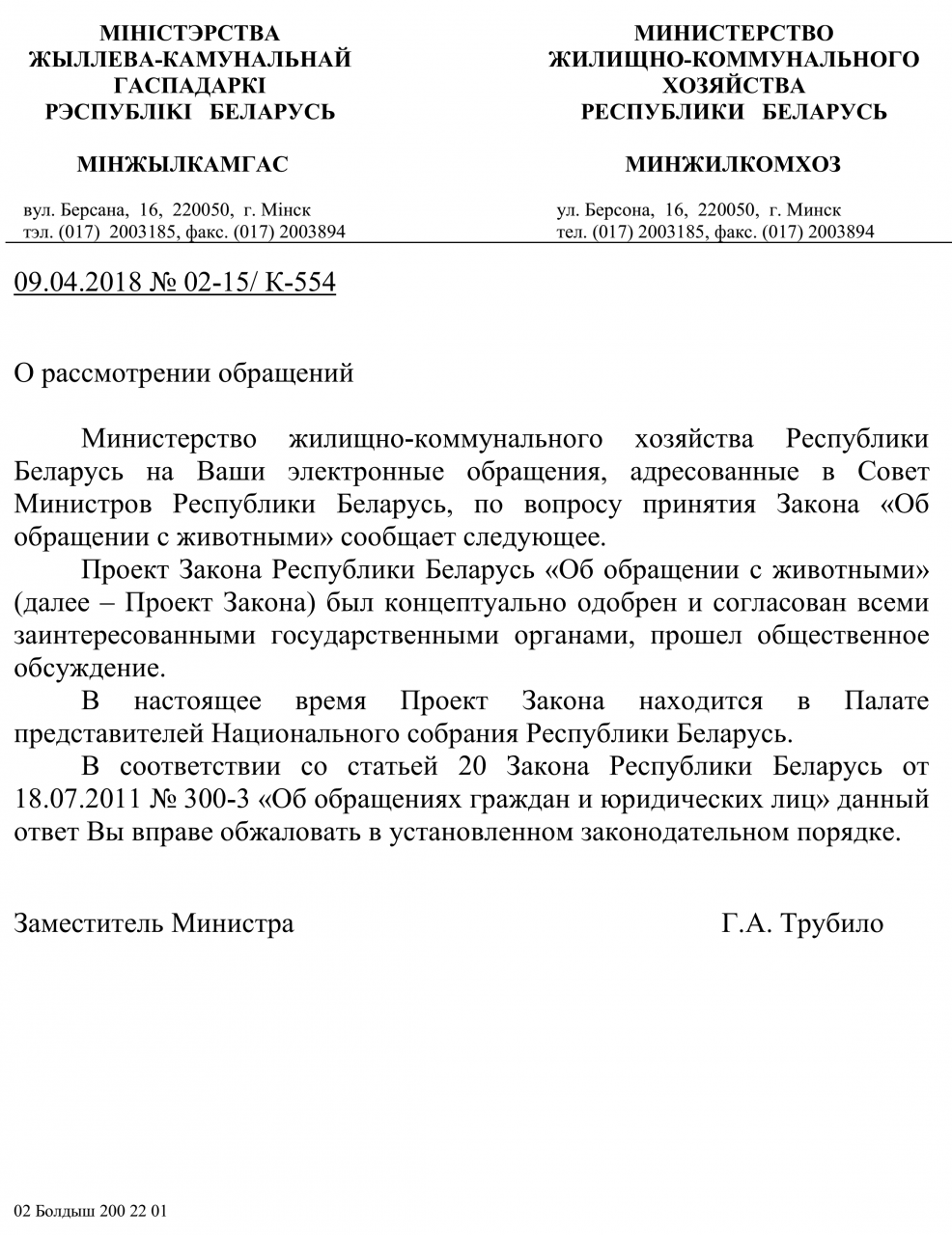 Проект Закона Республики Беларусь «Об обращении с животными» (далее – Проект Закона) был концептуально одобрен и согласован всеми заинтересованными государственными органами, прошел общественное обсуждение.