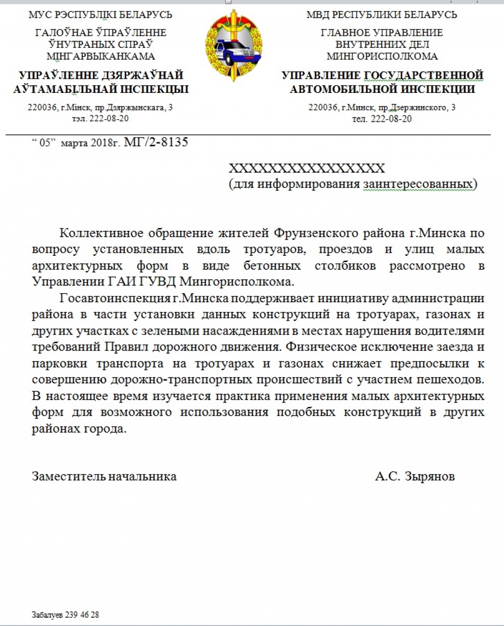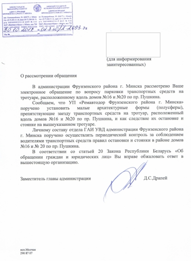 Просим Вас выразить благодарность администрации Фрунзенского района за проявленную инициативу и распространить практику установки ограждений, препятствующих парковке автомобилей на тротуарах и газонах в других районах города Минска.