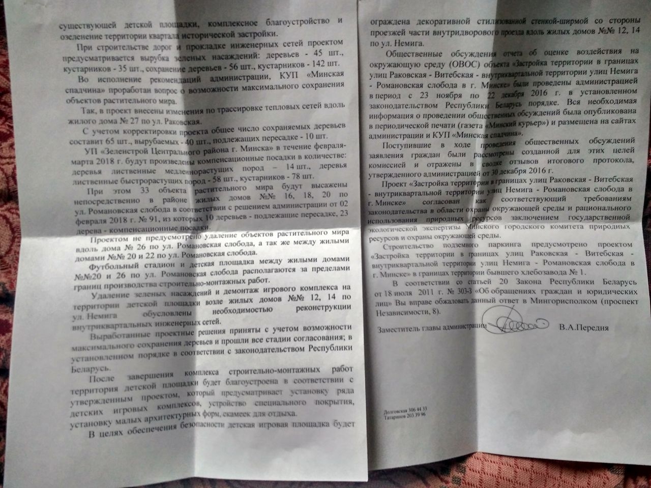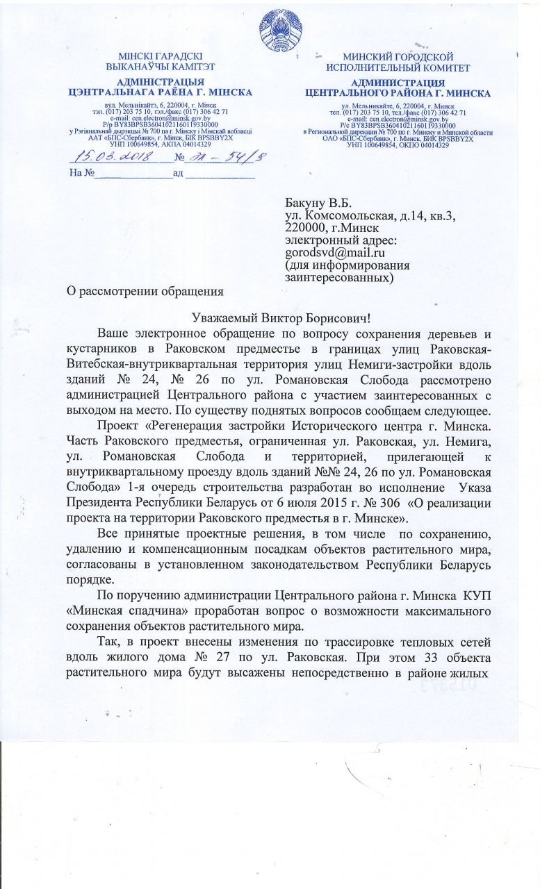 В связи с выше изложенным просим Администрацию Центрального района, УП Зеленстрой Центрального района, Заказчика проект КУП Минска Спадчина, ЖКХ Центрального Района и УП ЖЭУN1 в срочном порядке ещё раз пересмотреть таксационный план с целью корректировки в проекте инженерных коммуникаций . И предлагаем провести по вопросам, изложенным в нашем обращении срочное совещание так как проект уже начал реализоваться ,но большую часть деревьев и кустарников ещё можно спасти.Так из 246 планировалось вырубить 108 деревьев и около 300 кустарников.