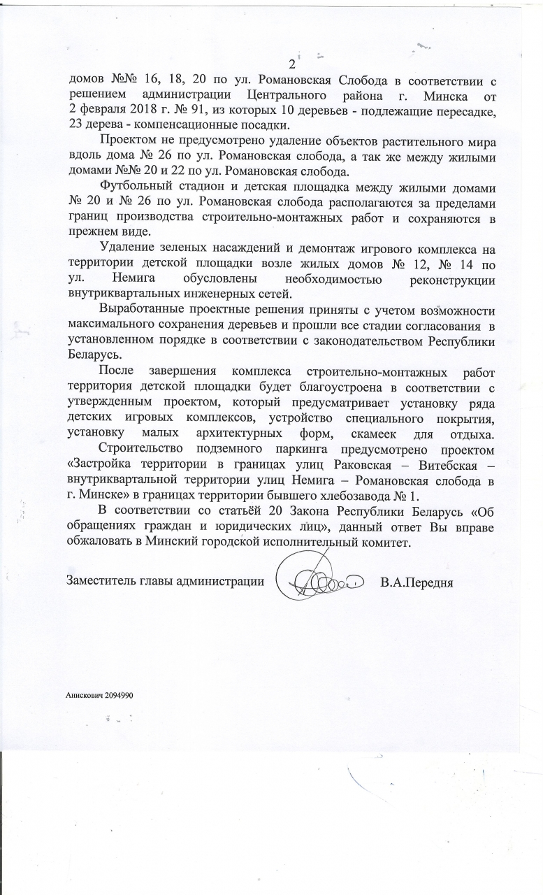 Хотелось бы что бы Администрация и Заказчик КУП Минская спадчина нашли наиболее правильный компромисс и проектное решение – максимально сохранив имеющийся зелёные насаждения и благоустройства для жителей квартала в тоже время реализовав проект.По общественному обсуждении которое было в декабре 2016 планировалось спилить 108 деревьев а также большое число кустарников. Также прошу кратко указать в ответе Результаты общественного обсуждения и экологических экспертиз в 2016 г.