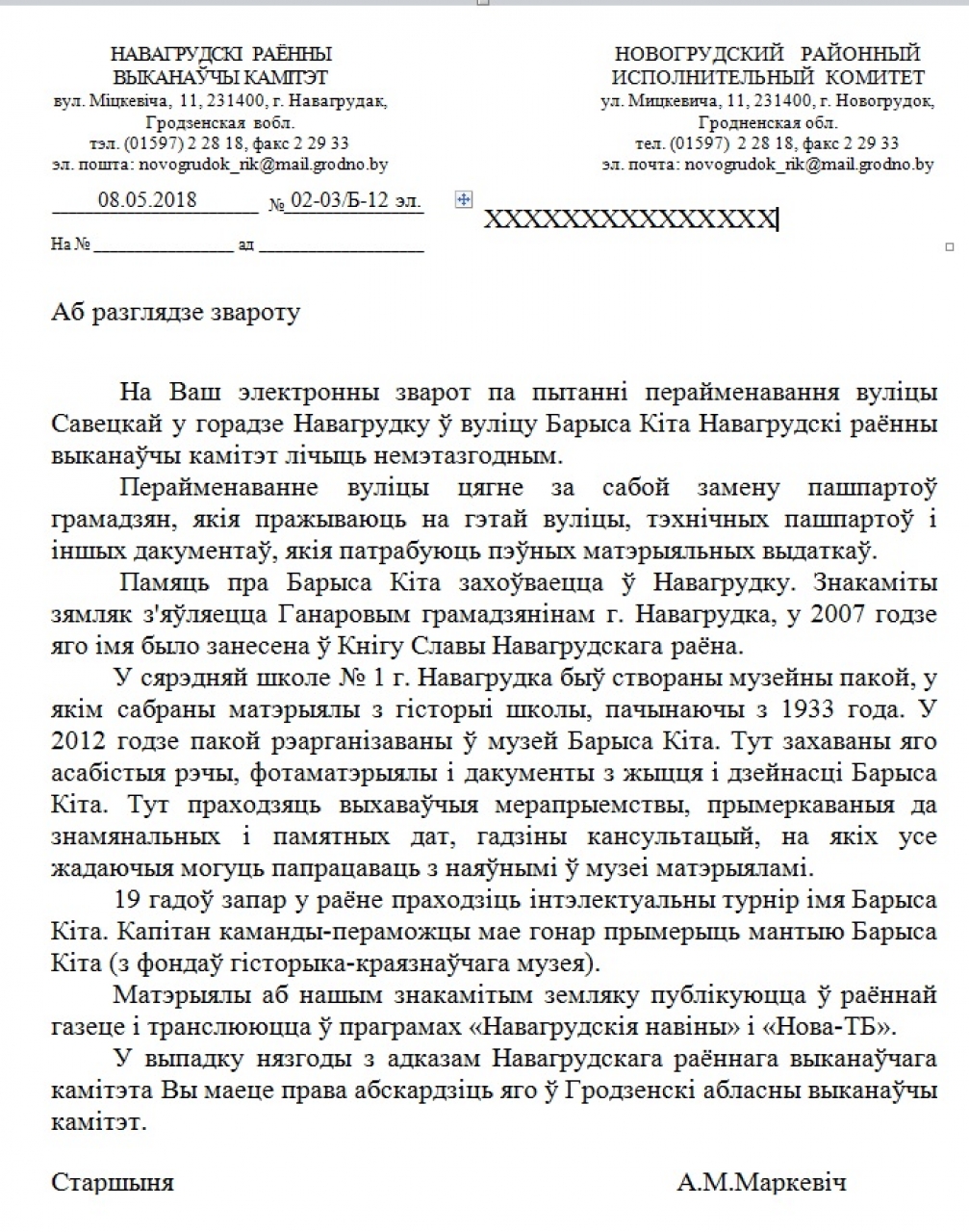Перайменаванне вуліцы Савецкай у горадзе Навагрудку ў вуліцу Барыса Кіта Навагрудскі раённы выканаўчы камітэт лічыць немэтазгодным. Памяць пра Барыса Кіта захоўваецца ў Навагрудку iншымi сродкамi.