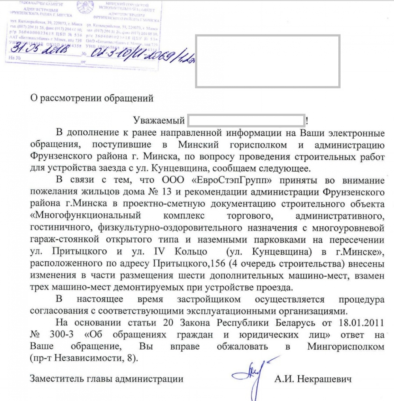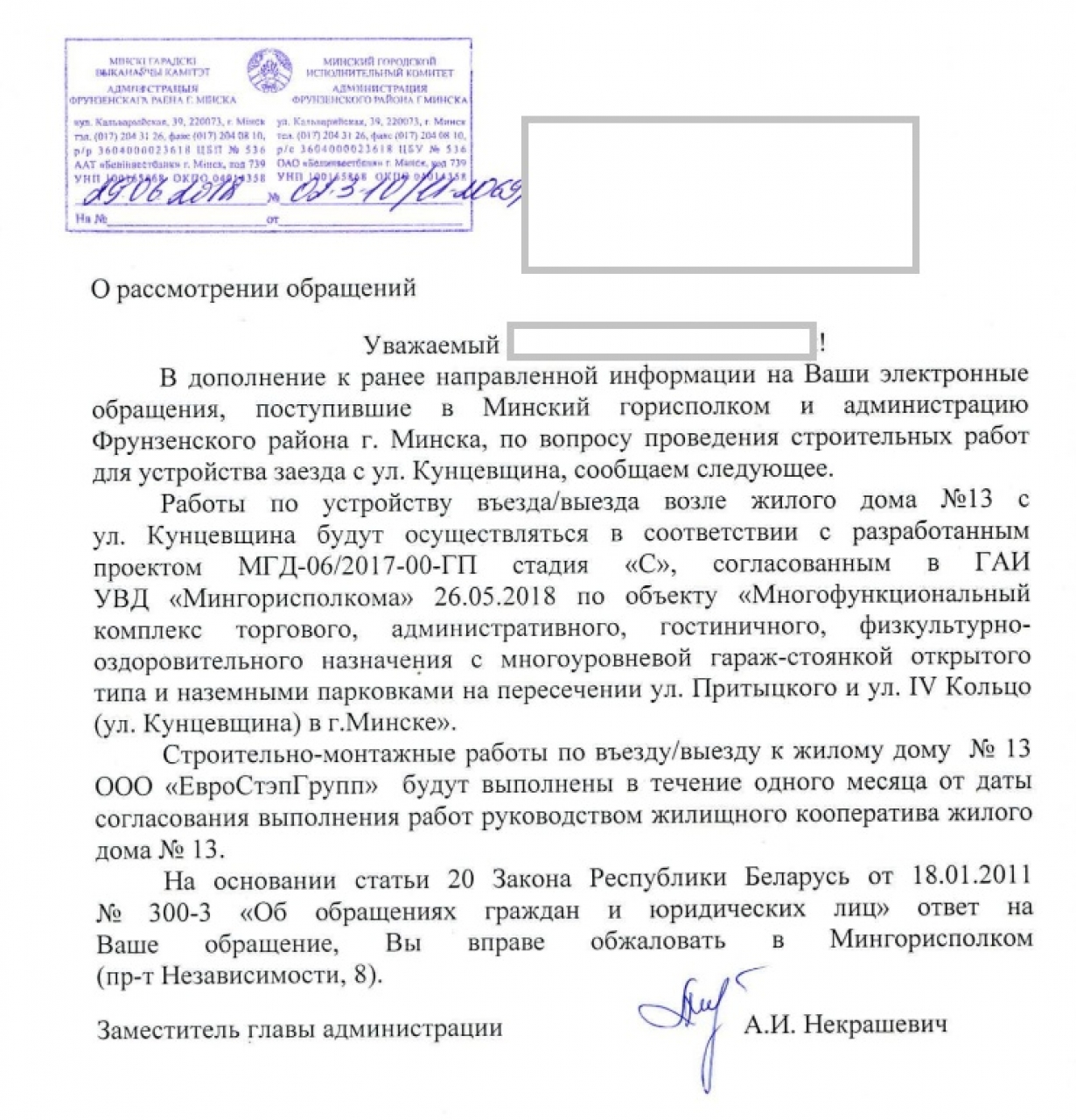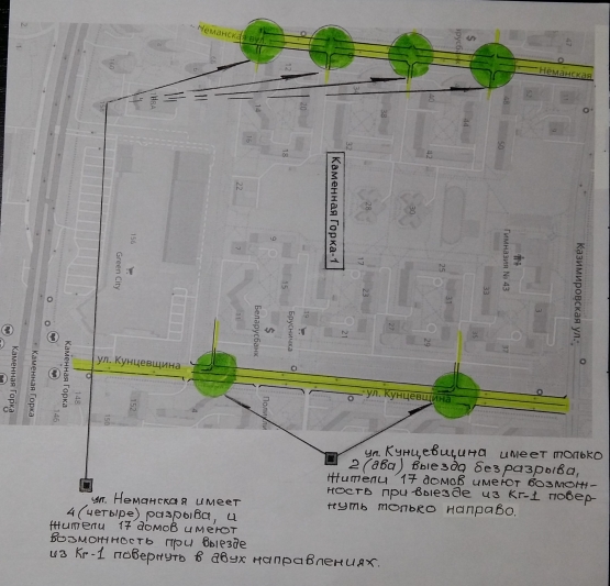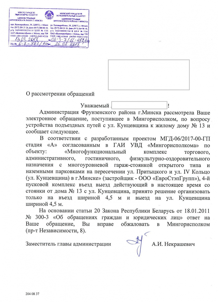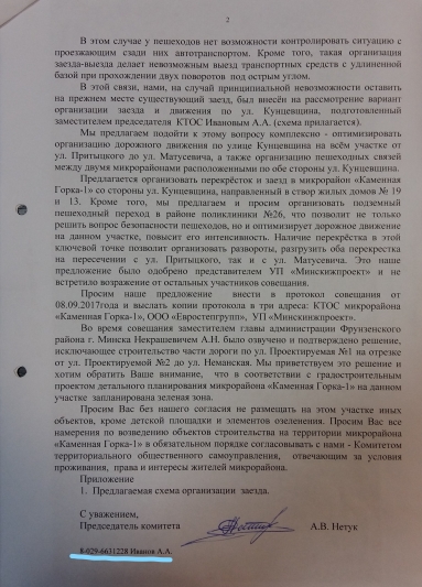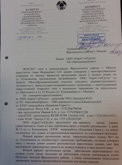 Ранее в Мингорисполком было направлено коллективное обращение граждан от 26 июля 2017 г. (перенаправлено в администрацию Фрунзенского р-на письмом от 28.07.17 №6-7-4976-эл), содержавшее вполне разумное предложение жителей Каменной горки об организации движения автотранспорта на ул.Кунцевщина, которое было озвучено на совместном к сожалению, пока единственном обсуждении с участием, представителей ООО "ЕвроСтэпГрупп", УП "МинскИнжПроект" и представителей Комитета самоуправления Каменной горки-1. Во время проведения обсуждения сторона, представляющая интересы жителей, вполне обоснованно высказалась против строительства въезда-выезда (вариант №1) и диагонального въезда-выезда (вариант №2) взамен существующего. Наше предложение о полноценном перекрестке было одобрено представителем УП "МинскИнжПроект" и не встретило возражений от остальных участников встречи. Для обозначения четкой позиции Комитета общественного самоуправления Кг-1 по данному вопросу и в связи с отсутствием протокола встречи сторон, КТОС отправил 12.09.2017 письменное сообщение всем участникам встречи.