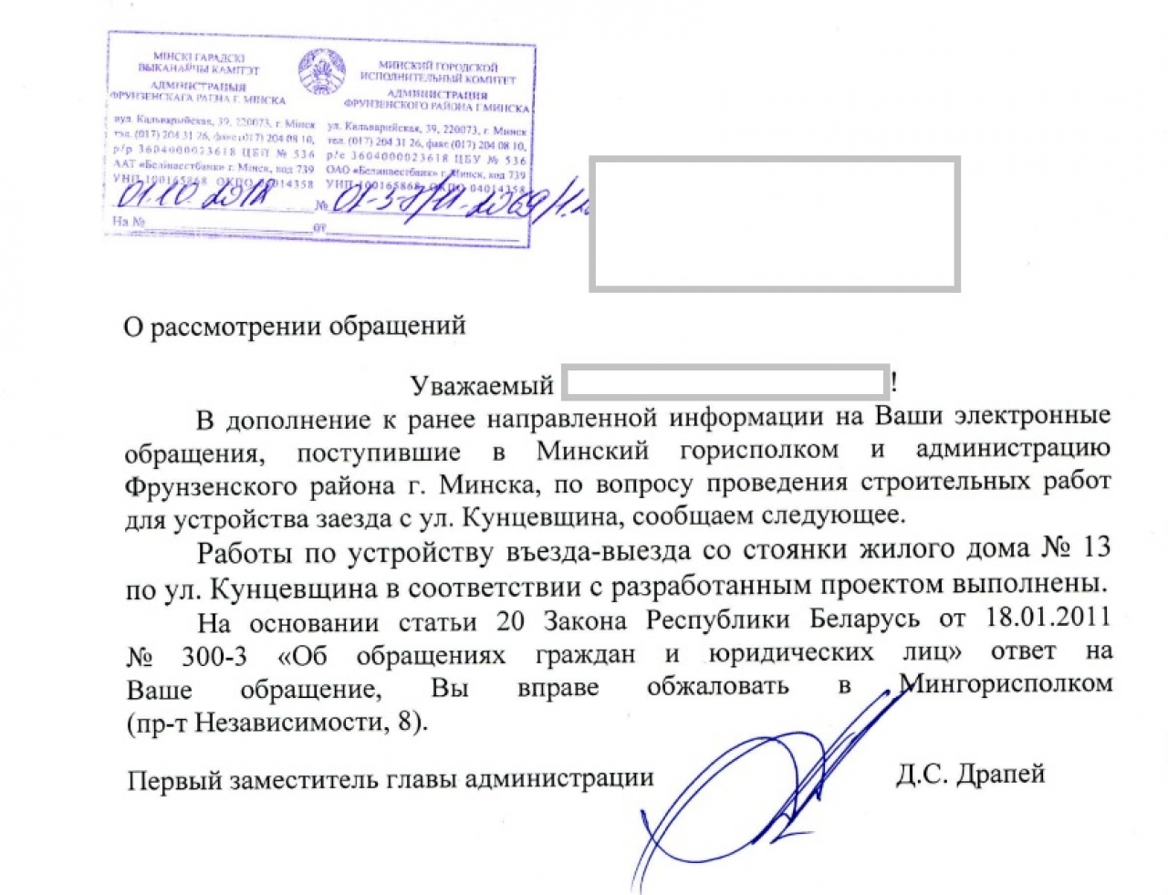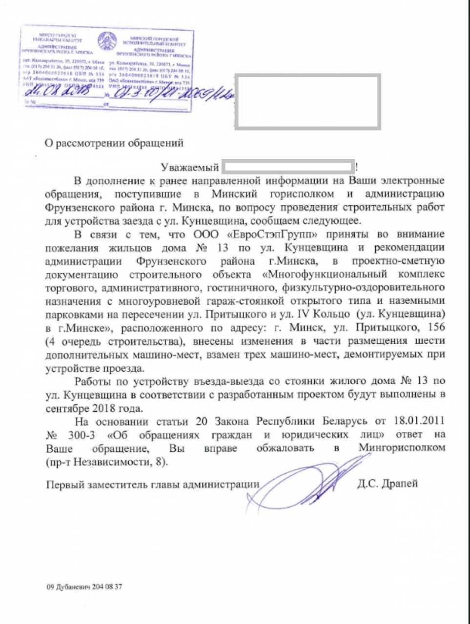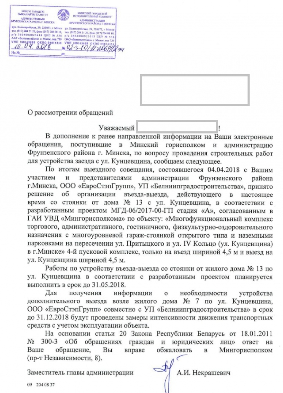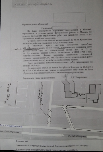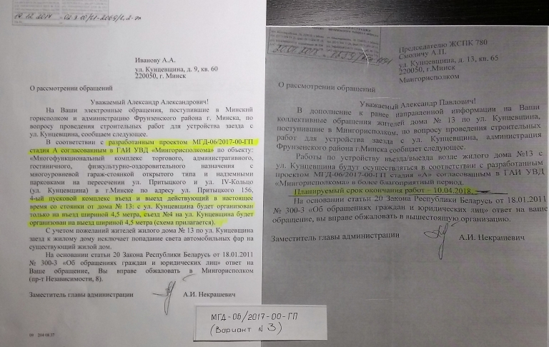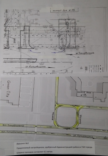 Но уже в декабре 2017 г. стало понятно - нас не услышали. В адрес первого заявителя Иванова А.А. пришло сообщение от Администрации Фрунзенского района, где сообщается о вновь разработанном проекте, опять согласованном в ГАИ УВД Мингорисполкома, который содержит уже два проезда (шириной 4,5 м), один будет служить въездом (существующий), а второй опять напротив дома №13 по ул. Кунцевщина - выездом. Предложенный выезд с прилегающей территории создает трудности как для выезжающих из района, так и для въезжающих, чьи пути пересекаются.