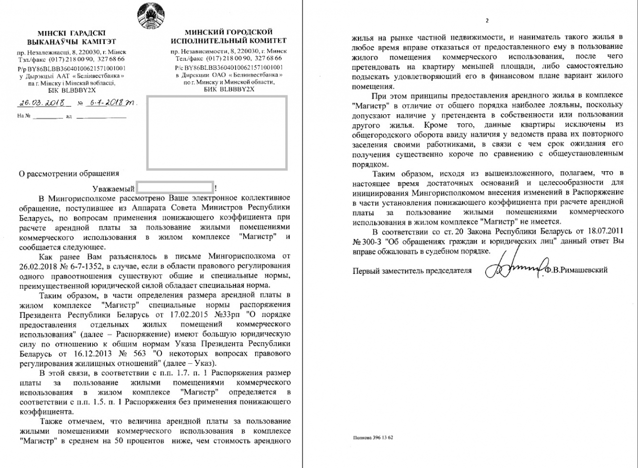 - Администрацию Первомайского района (ответы №456 от 06.11.2014, №1-2-7/2074/1-11 от 10.11.2014, №1-2-7/607/1 от 04.03.2016); Минский городской исполнительный комитет (ответы №01-15/р-332 от 04.03.2015, №6-7-34/5/1 от 17.04.2015, №6-7-7679/1 от 16.06.2015, №6-7-178/1,2 от 25.01.2017);