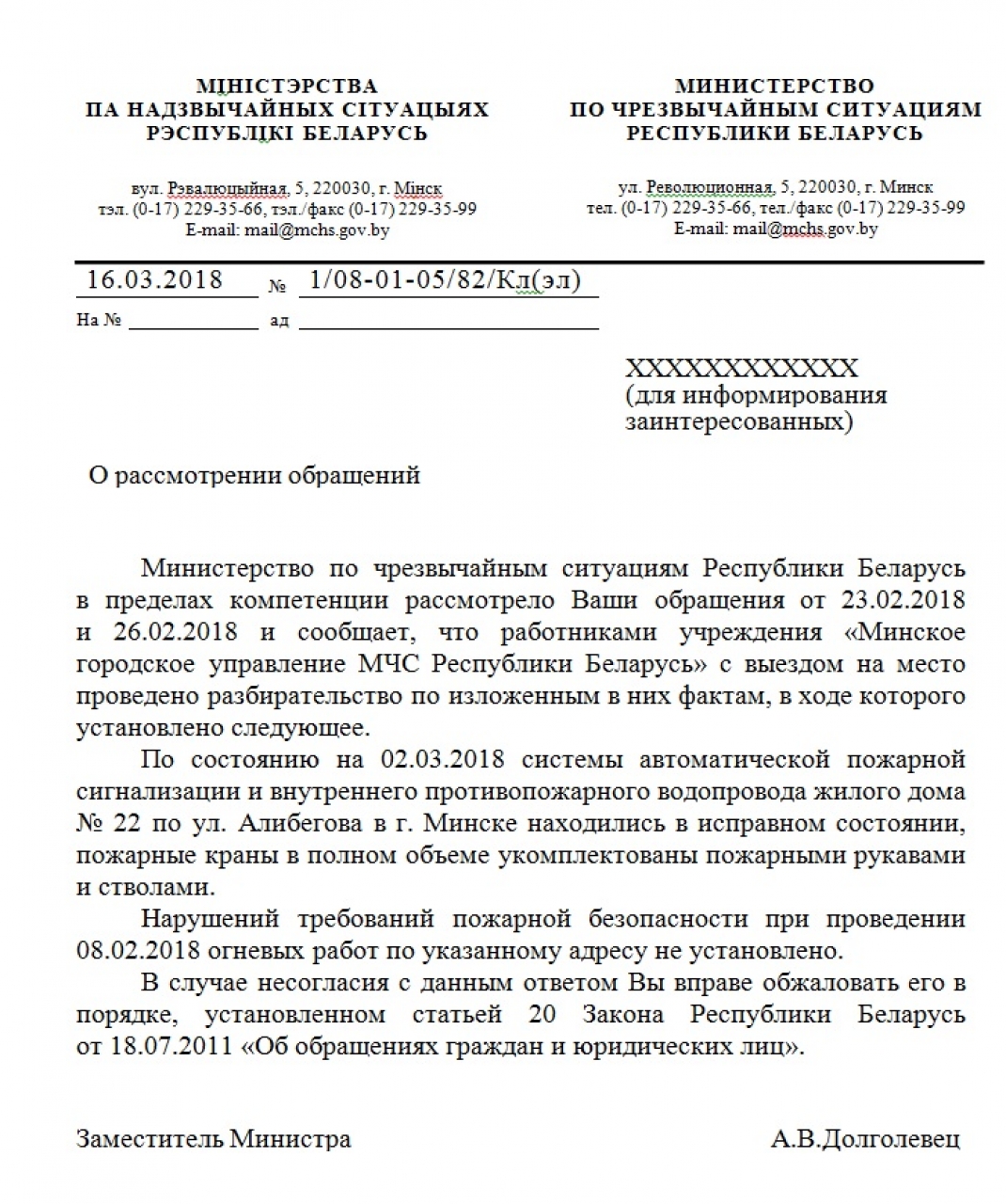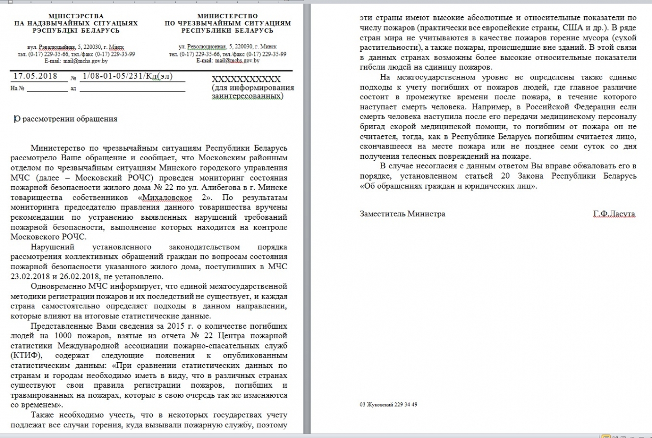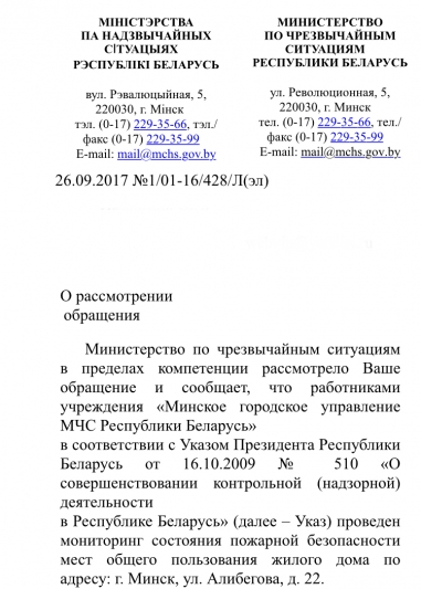 Просим принять соответствующие меры реагирования по вопросам пожарной безопасности в отношении неэффективности работы системы предупреждения о пожаре «Молния», так например, сегодня 8 февраля 2018 года, в доме номер 22 по ул. Алибегова в г. Минске сработала система предупреждения о пожаре из-за несанкционированного проведения сварочных работ на 19 этаже в 22 доме. Сигнализация работала на протяжении часа, Главный инженер и Председатель правления ТС о проводимых работах ничего не знают, меры по правилам пожарной безопасности не применяют. Система водяного пожаротушение 22 многоэтажного жилого дома, несмотря на неоднократные обращения в адрес МЧС неработают. Пожарные щиты шлангами и насадками по прежнему не укомплектованы. Пожарные водопроводы не могут нормально функционировать в случаях черезвычайной ситуации. Просим обеспечить эксплуатацию жилого дома в соответствии правил пожарной безопасности, обязать должностных лиц выполнять свои обязанности, а также проинформировать подписавших обращение граждан о принятых мерах в соответствии с законами Республики Беларусь.