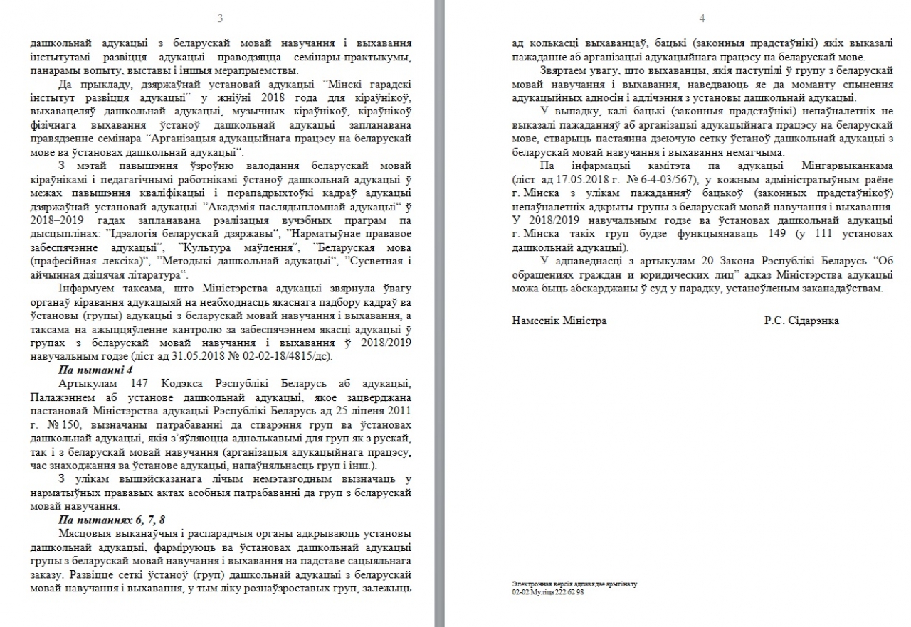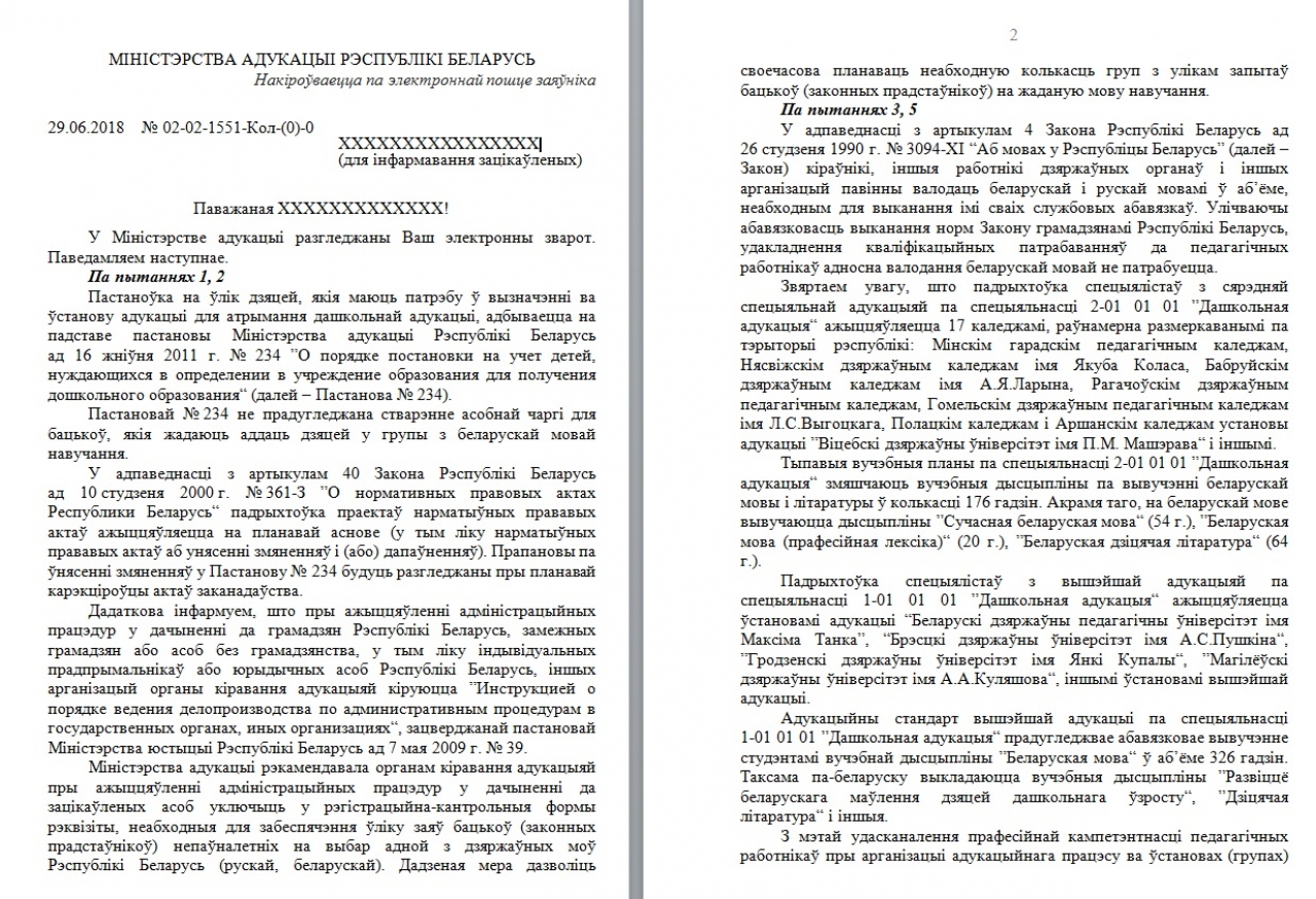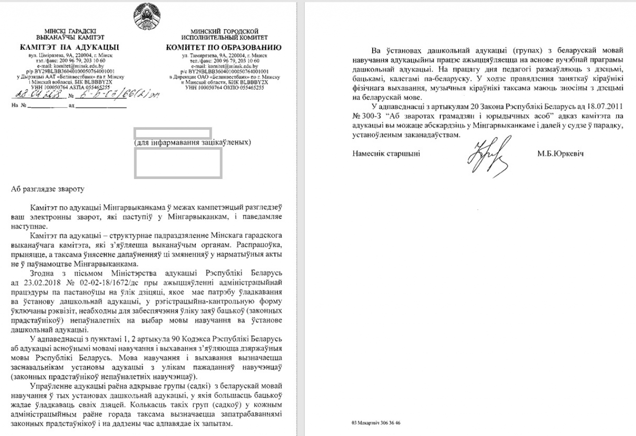 Осенью 2017 года небезразличные белорусы направили в Министерство образования коллективное обращение, в котором просили изменить существующую систему учёта детей и дать возможность выбора языка образования на первом шаге записи в дошкольные учреждения - в районных администрациях. Было собрано 482 подписи, но Министерство не увидело проблемы.