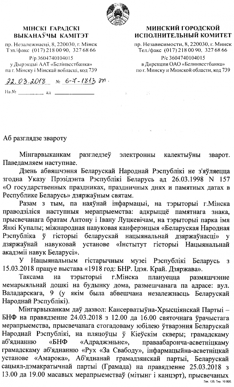 Мы лічым, што адзначыць на дзяржаўным узроўні гэтую падзею, момант усведамлення беларусаў сябе як нацыі, здольнай самастойна вырашаць свой лёс, куды больш важна, чым адзначыць стварэнне 100 гадоў таму ў Маскве Расійскага камуністычнага саюза моладзі (пазней УЛКСМ), інструмента выкарыстання моладзі дзеля патрэбаў таталітарнага камуністычнага рэжыму (а гэты дзіўны юбілей ужо атрымаў цэлы Рэспубліканскі камітэт).