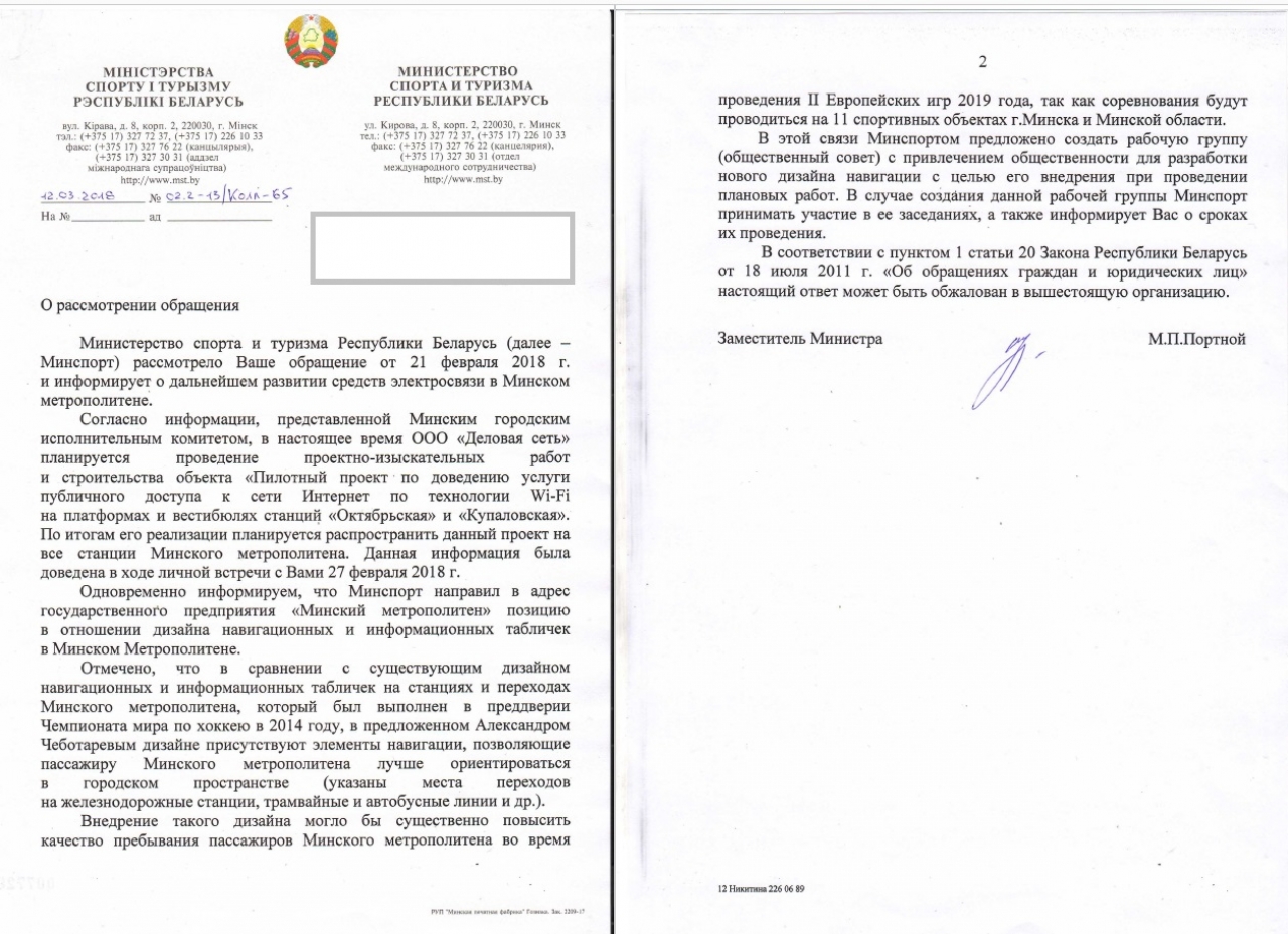 2. Повторно рассмотреть предложенный вариант дизайнера Александра Чеботарева и реализовать на одной из станций минского метрополитена(для оценки пассажирами метро), либо провести открытый конкурс на создание новой навигации и метросхем в ближайшее время.