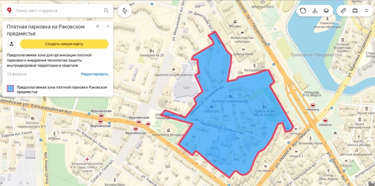 "В настоящее время указанная территория(Раковского предместья) не внесена в перечень автомобильных парковок, на которых взимается плата. Для организации взимания платы за парковку необходимо соответсвующее решение МГИК.