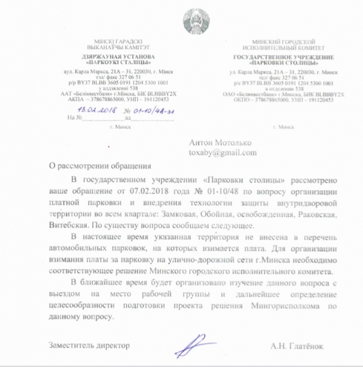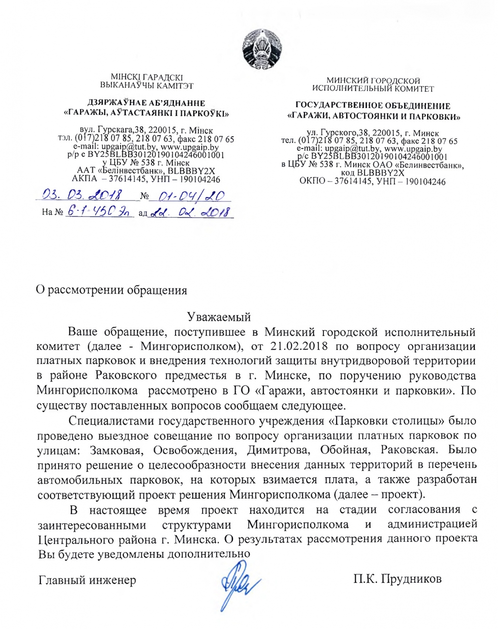 В ближайшее время будет организовано изучение данного вопроса с выездом на место рабочей группы и дальнейшее определение целесообразности подготовки проекта решения Мингорисполкома по данному вопросу" (копия ответа прилагается).
