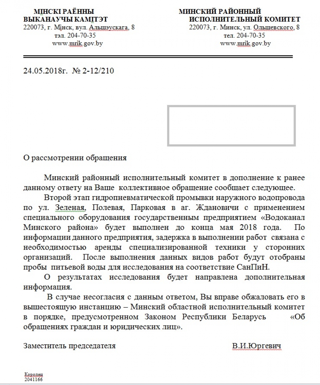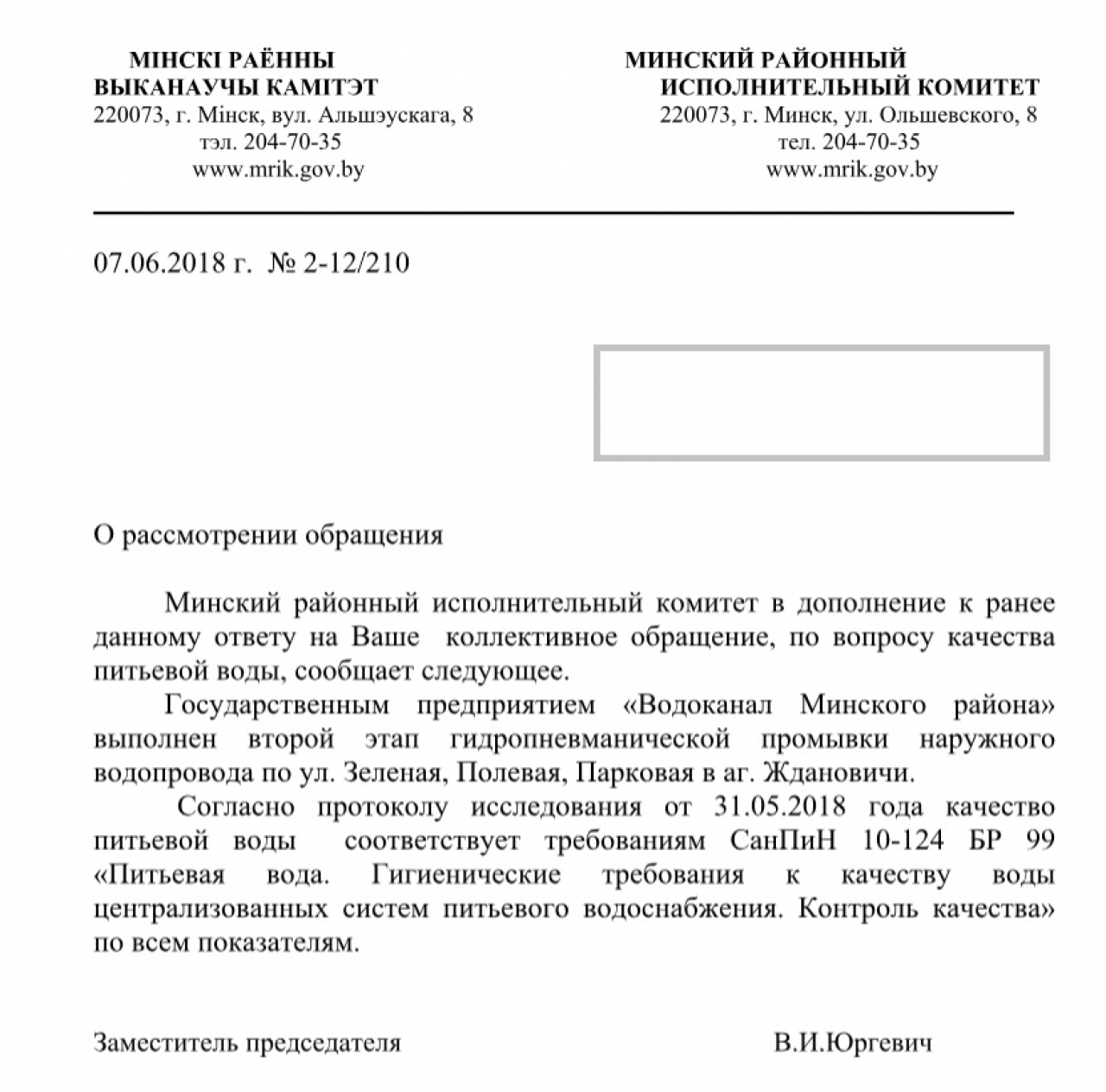 В домах по ул. Зеленая, а также в домах по ул. Парковая, Полевая и др. в аг. Ждановичи вода ежедневно имеет желтый оттенок и неприятный запах. Согласно лабораторным анализам Минского зонального центра гигиены и эпидемиологии, питьевая вода из источников централизованного водоснабжения не соответствует гигиеническим нормам по физико-химическим показателям, мутности и содержанию железа. Содержание железа выше 1 мг на кубический дециметр при норме 0,3 мг/куб. дм и допустимом значении до 1 мг/куб (требование СанПин 10-124 Республики Беларусь 99). В соответствии с гигиеническими требованиями СанПин 10-124 Республики Беларусь 99: «Питьевая вода должна быть безопасна в эпидемическом и радиационном отношении, безвредна по химическому составу и иметь благоприятные органолептические свойства».