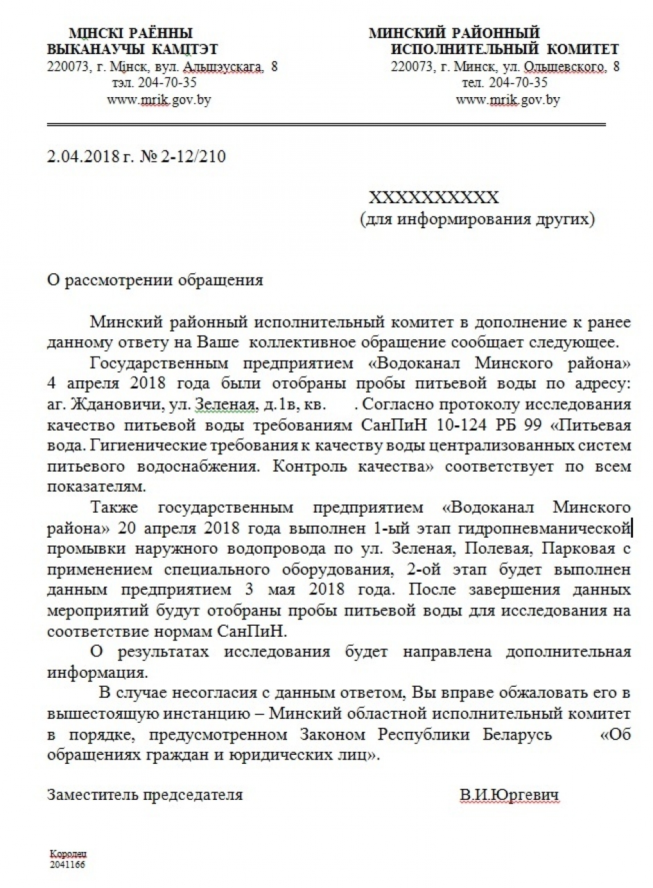Государственным предприятием «Водоканал Минского района» были отобраны пробы питьевой воды. Согласно протоколу исследования качество питьевой воды требованиям СанПиН 10-124 РБ 99 «Питьевая вода. Гигиенические требования к качеству воды централизованных систем питьевого водоснабжения. Контроль качества» соответствует по всем показателям.