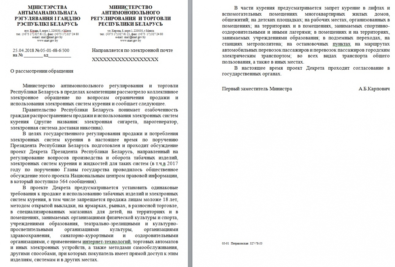 В настоящее время проходит обсуждение проект Декрета, в котором предусматривается установить одинаковые требования к продаже и использованию табачных изделий и электронных систем курения, в том числе запрещается продажа лицам моложе 18 лет.