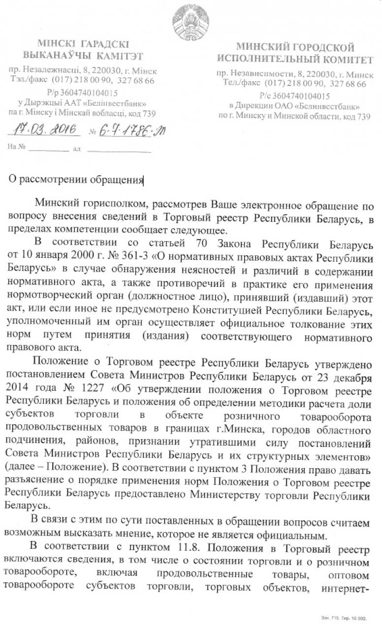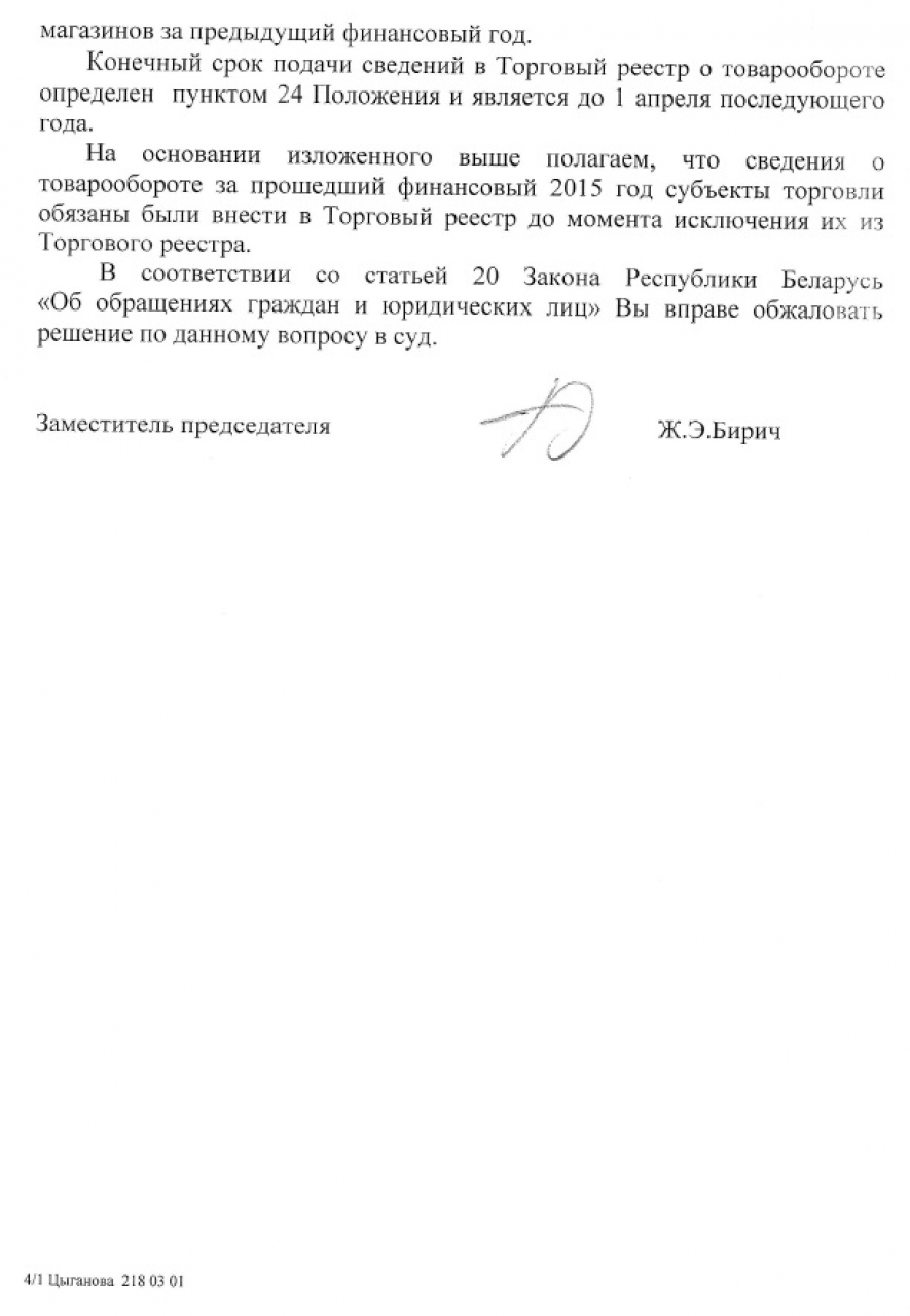 В соответствии с п. 24 Положения о Торговом реестре Республики Беларусь, утвержденного постановлением Совета Министров Республики Беларусь от 23 декабря 2014 г. № 1227, субъект торговли ежегодно до 1 апреля представляет в соответствующий местный исполнительный и распорядительный орган заявление о внесении изменений и (или) дополнений в сведения, включенные в Торговый реестр, с указанием информации, предусмотренной в абзаце втором подпункта 11.8 пункта 11 указанного Положения, а именно о розничном товарообороте, включая продовольственные товары, оптовом товарообороте субъектов торговли, торговых объектов, интернет-магазинов за предыдущий финансовый год.