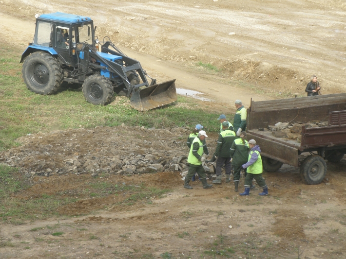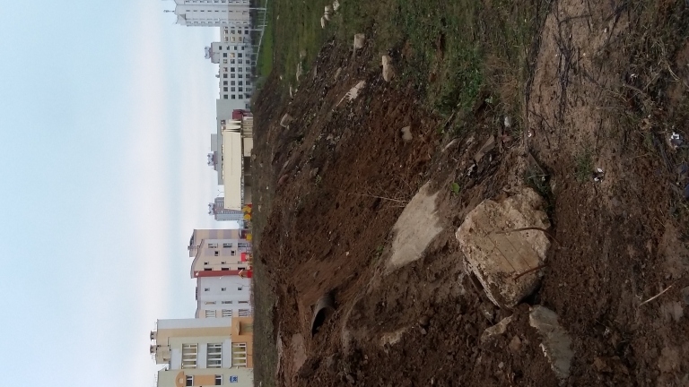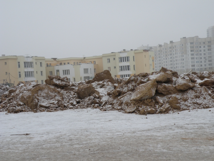 Неизвестные застройщики в период осень-зима 2014 года предварительно вывезли (срезанный при строительстве домов нашего района) плодородный грунт, складированный ранее на территории (Б), взамен заполняя площадь пустыря строительным мусором, включающего обломки железобетона с оголенным армирующим материалом.