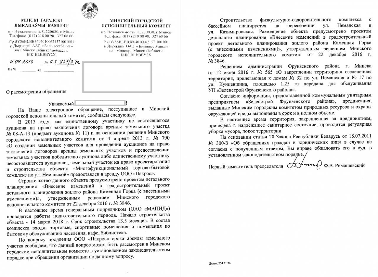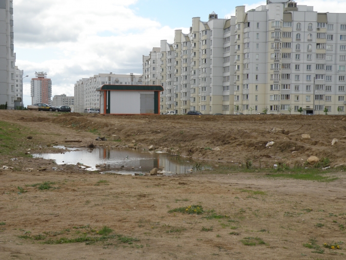 Другая половина пустыря (территория А) существенных изменений не претерпела, решением Мингорисполкома от 04.04.2013 года было передано ООО"Пакрос" право аренды для строительства многофункционального торгово-бытового комплекса. В дальнейшем согласно ответа Администрации Фрунзенского района от 30.12.2016 года "заказчиком строительства были нарушены сроки по освоению земельного участка, поставлен вопрос об изъятии", но в виду отсутствия иных претендентов опять продлен срок для ООО "Пакрос" . Все эти годы участок имел неприглядный вид. Работы проводились нечасто, в основном силами работников ЖЭС-128, в ущерб своих прямых обязанностей по уборке закрепленных придомовых территорий и жилых домов.