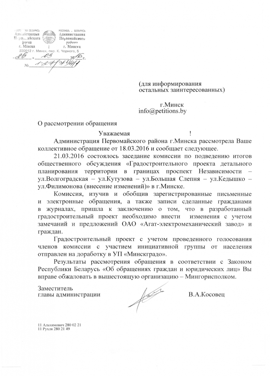 4. Личные приемы граждан у Главы Администрации Президента Косинца А.Н., у Министра ЖКХ Терехова А.А., у депутата Палаты Представителей Жилинского М.Г., у депутата Горсовета Кузнецова В.Н. нашли понимание нашей обеспокоенности планами такой поспешной «экспериментальной» надстройки, рискованной и псевдоэкономичной.