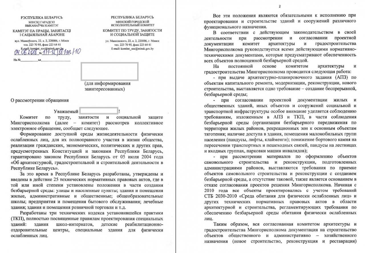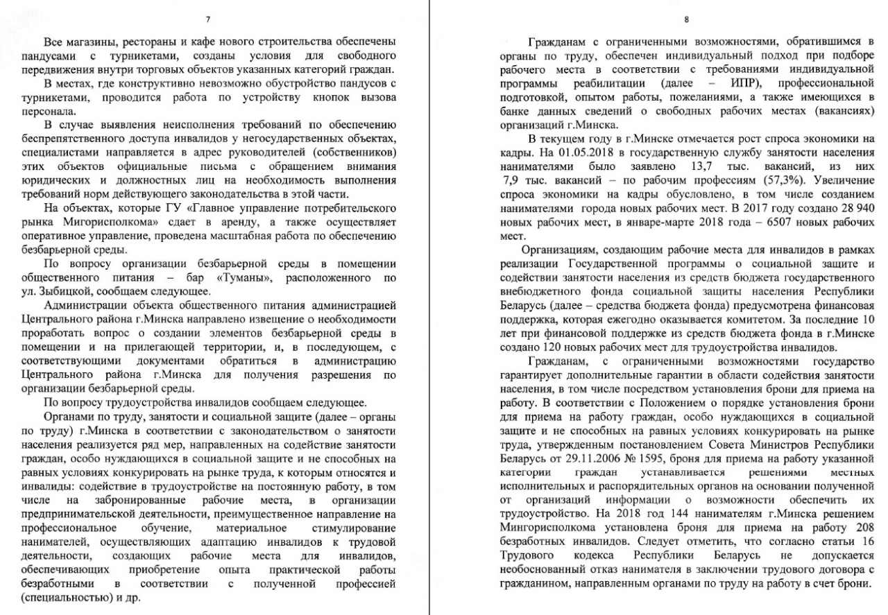 В связи с этим Мингорисполкому и местным администрациям совместно с Министерством труда и социальной защиты РБ предлагаем проработать ряд мер по улучшению ситуации, в местах массовых мероприятий в местах отдыха,общепита и развлекательной сферы ,государственных и частных учреждений - как одно из предложений разработать инструкцию и правила - как действовать когда человек с ограниченными возможностями пришёл отдохнуть в кафе или бар или на приём к чиновнику - при этом что бы люди с ограниченными возможностями не чувствовали себя ущемленными,а были абсолютно равными со всеми остальными членами общества в любом общественном месте.