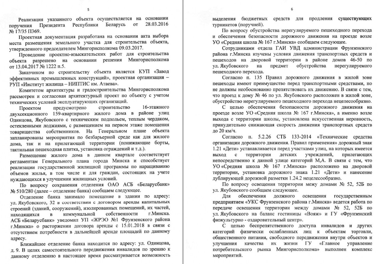 Отдельным пунктом обратить внимание на проблему слабовидящих и незрячих во Фрунзенском районе города Минска.Единственное место где люди с ограничеными возможностями могут гулять хотят уплотнить жилым домом - что нарушает Конвенцию о правах инвалидов.В микрорайоне Запад-4 Минска есть завод слепых и 6 домов рядом ,где инвалиды компактно проживают.Проблемы:1)Вернуть отделение сбербанка по Якубовского,32,в которое незрячие добирались легко,без посторонней помощи.Совсем уж непонятно-зачем ликвидировать объект пользующийся спросом и находящийся здесь со дня основания района.2)Нет ни одного знака предупреждающего водителей,что по Якубовского,46,расположена школа.Не обозначены переходы к ней и отсутствует пешеходная дорожка со стороны дома №48--дети вынуждены идти по проезжей части полотна.3)Несмотря на жалобы,до сих пор отсутствует освещение дорожки между"Светоприбором" с одной стороны и магазином,кафе,ФОЦем с другой.4)В случае уплотнения высоткой,незрячие 48 дома лишаться:детской площадки,территории безбарьерной среды,прохода в лесопарк"Медвежино"--дом окажется в четырех дворах!!!???