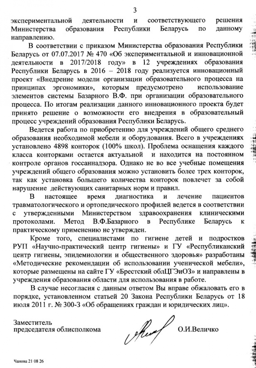 Основой технологии Базарного (а это 44 международных патента в области здоровьесбережения) является такой вид ученической мебели как конторка. Согласно Постановлению Министерства здравоохранения Республики Беларусь от 15 июля 2010 г. № 94 (п. 74, 75, 76, 128) конторки как вид ученической мебели могут применяться в учебных помещениях.