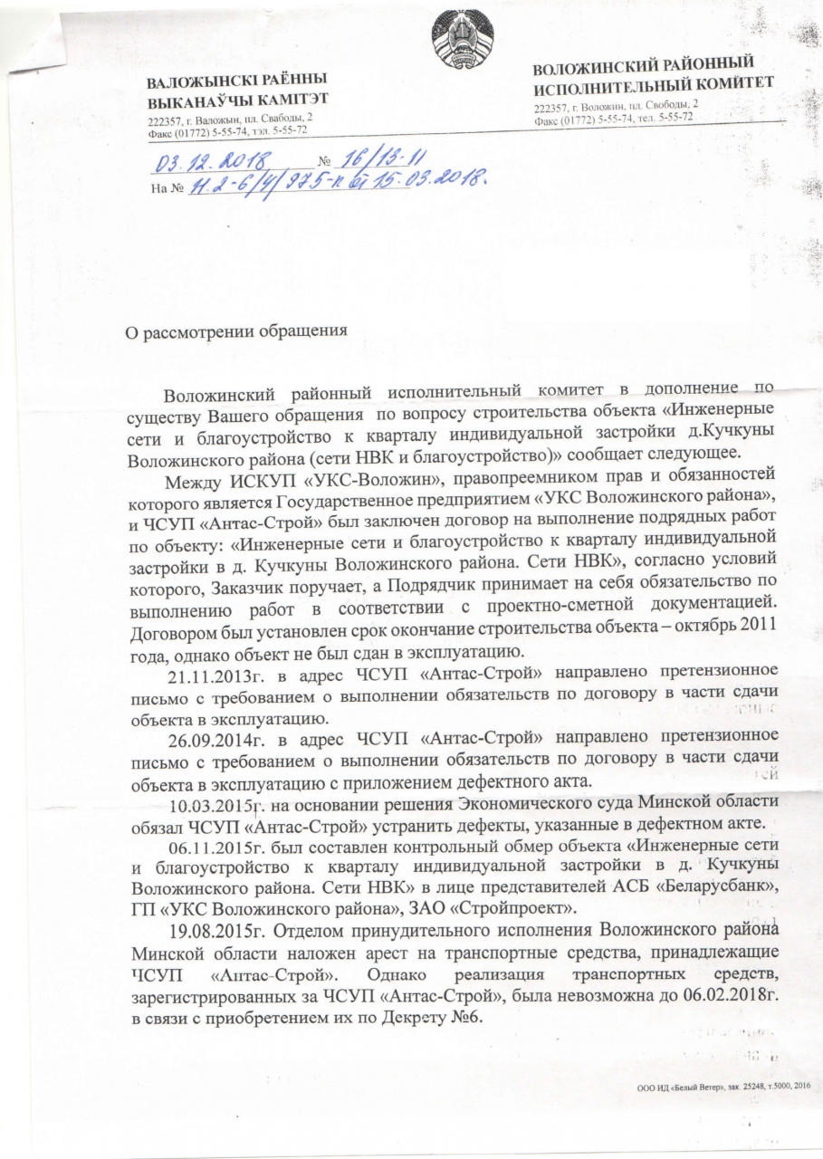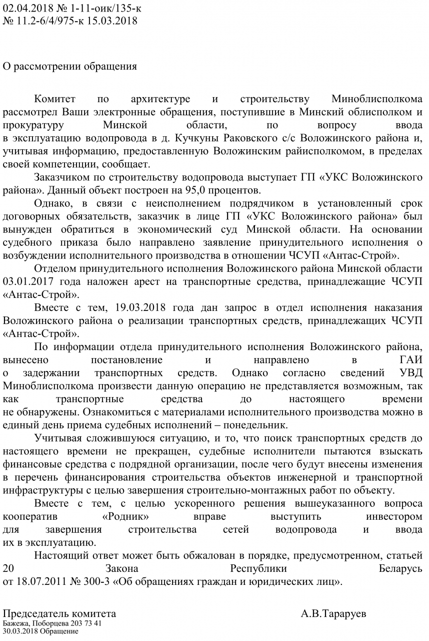 Жители деревни, застройщики нового поселка неоднократно обращались по вопросу возобновления строительства водопровода в Раковский сельский совет, УКС Воложинского района, Районный Исполнительный Комитет Воложинского района, Миноблисполком, Комитет по архитектуре и строительству.