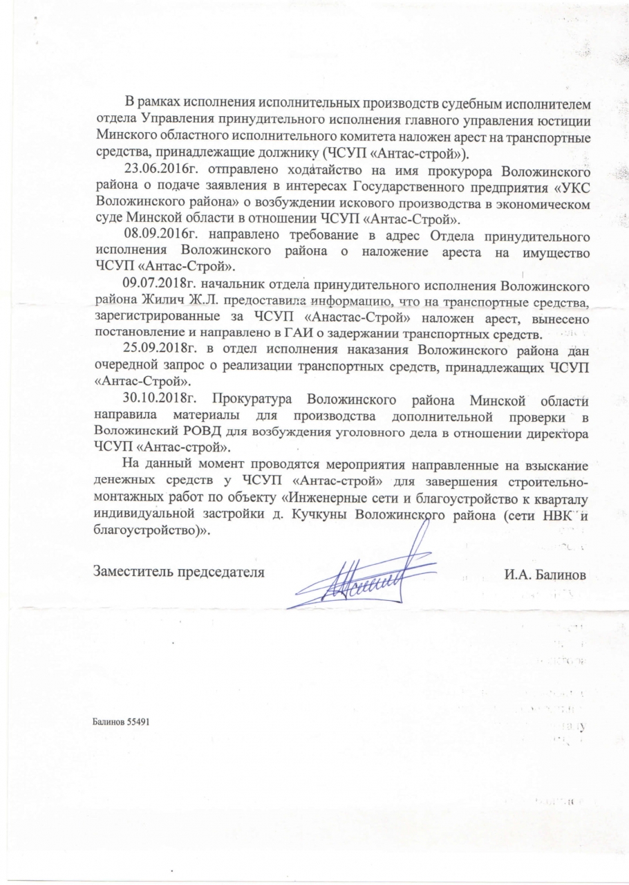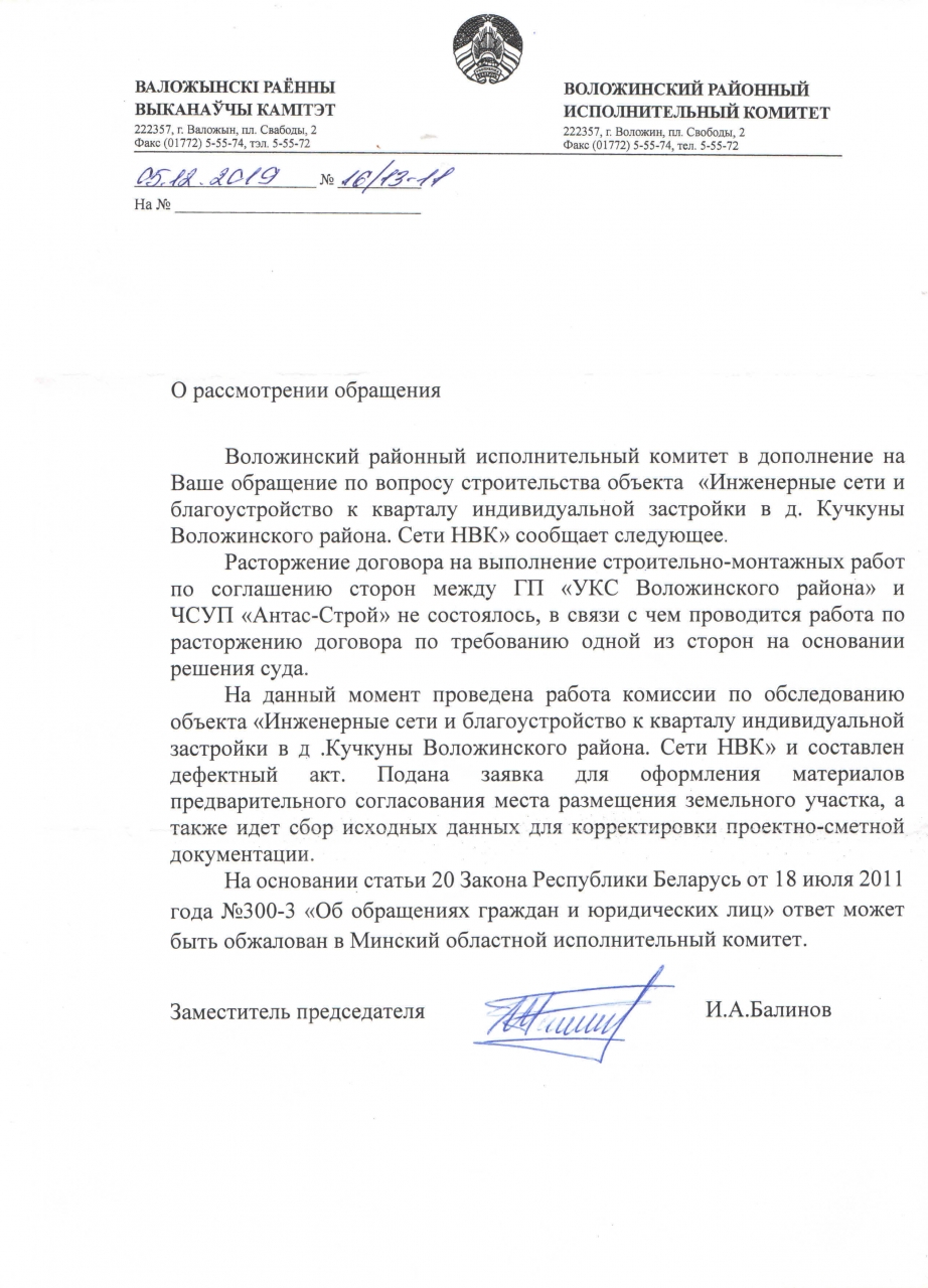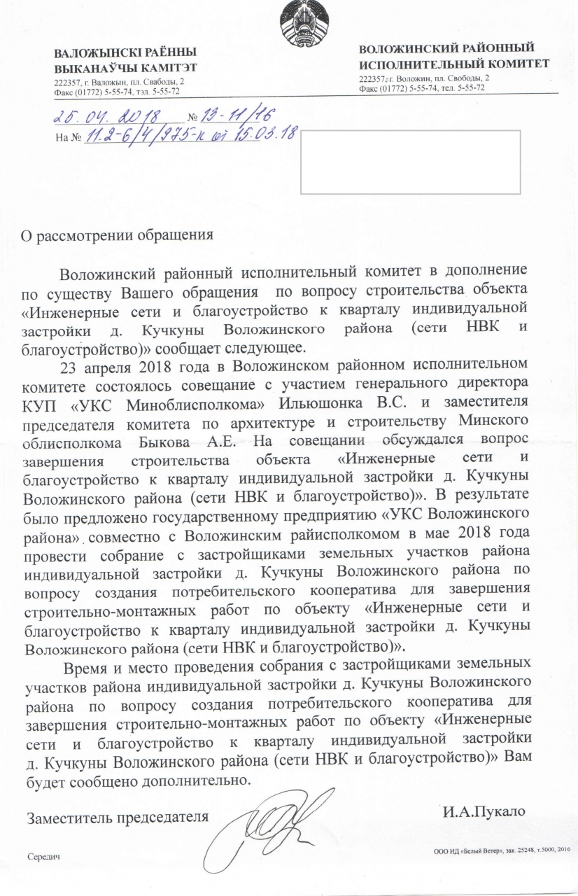 - принять меры по вводу в эксплуатацию центрального водопровода в д. Кучкуны Воложинского района, согласно Указу Президента Республики Беларусь № 72 от 07.02.2006 г.;