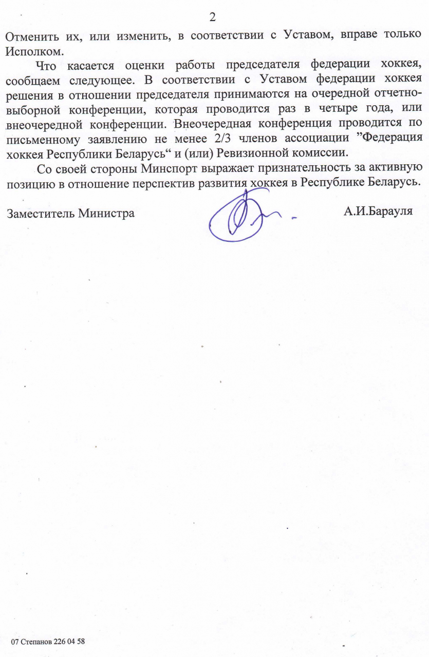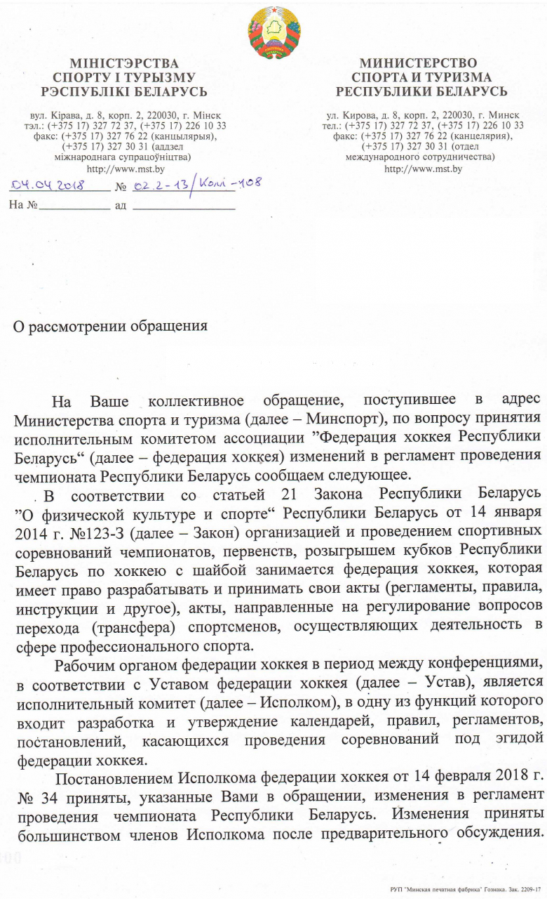 Таким образом, мы настаиваем на отмене либо на доработке изменений в регламенте Экстралиги со следующего сезона. В противном случае, эти реформы будут способствовать уменьшению зрительского интереса к Чемпионату Беларуси, неоправданному росту заработной платы молодых игроков, оттоку качественных и опытных игроков Экстралиги и снижению конкурентоспособности клубов на международной арене, и как следствие, снижению уровня сборной. Очень рассчитываем на взаимопонимание с Вашей стороны. Ведь у нас с Вами общая цель: сильный чемпионат, конкурентоспособное «Динамо» Минск и успешные выступления сборной Беларуси.