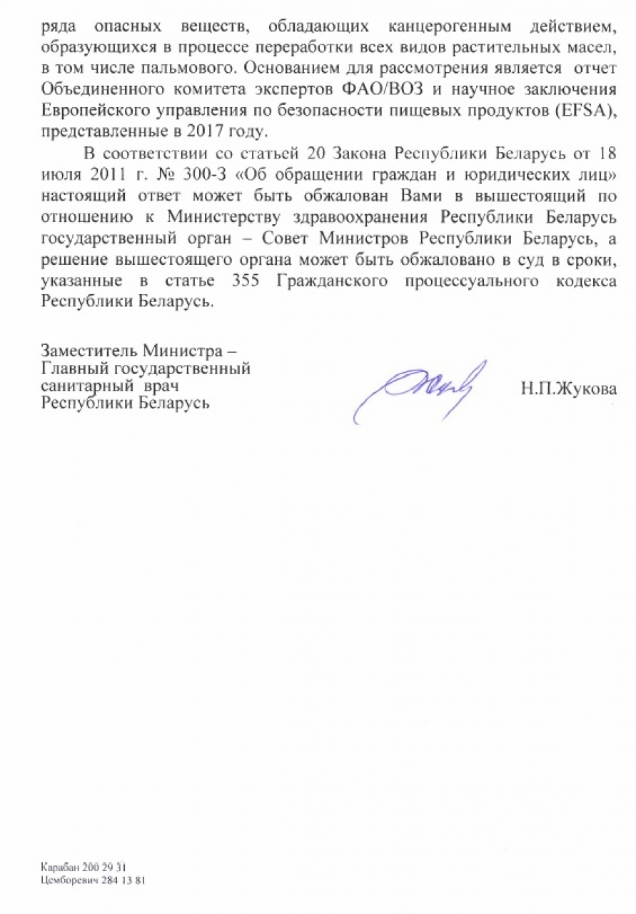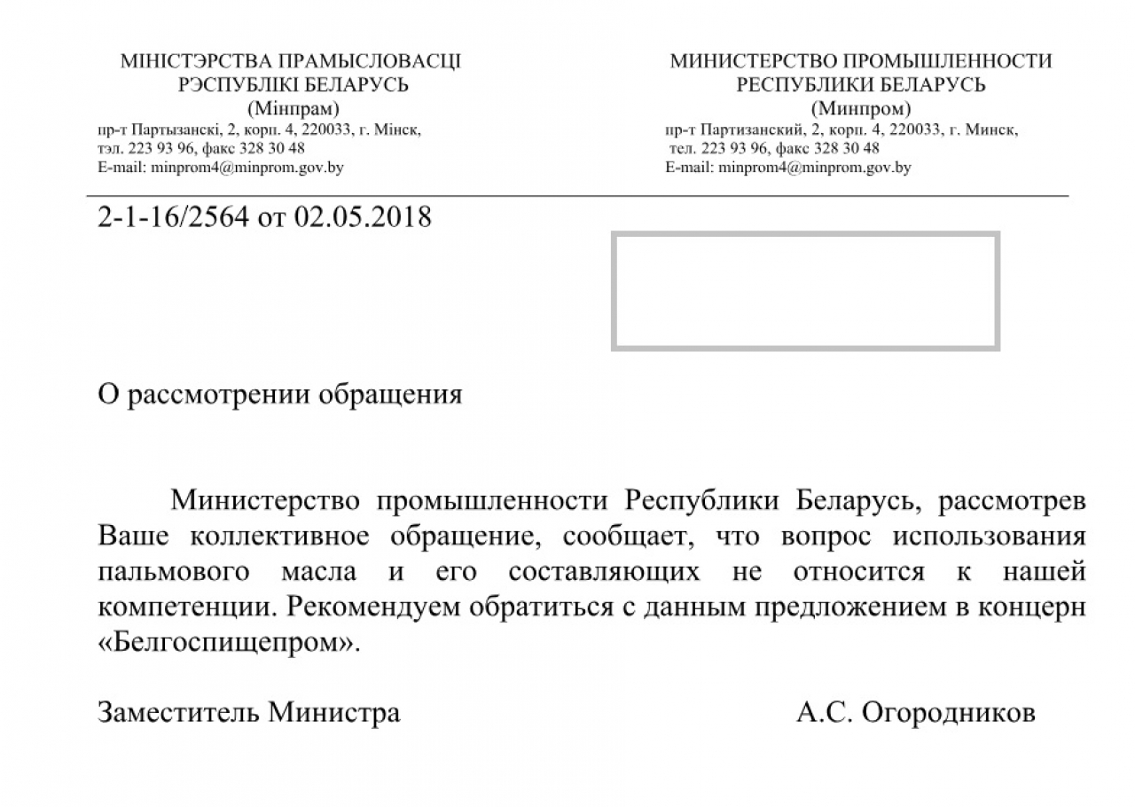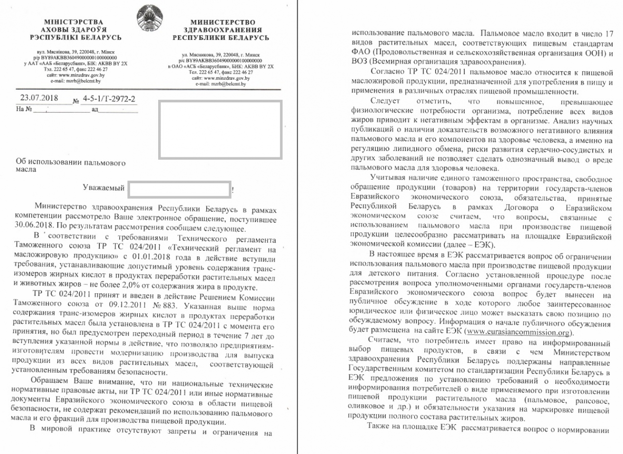 Коллективное обращение о необходимости сокращения использования пальмового масла и его составляющих в пищевой промышленности Республики Беларусь.