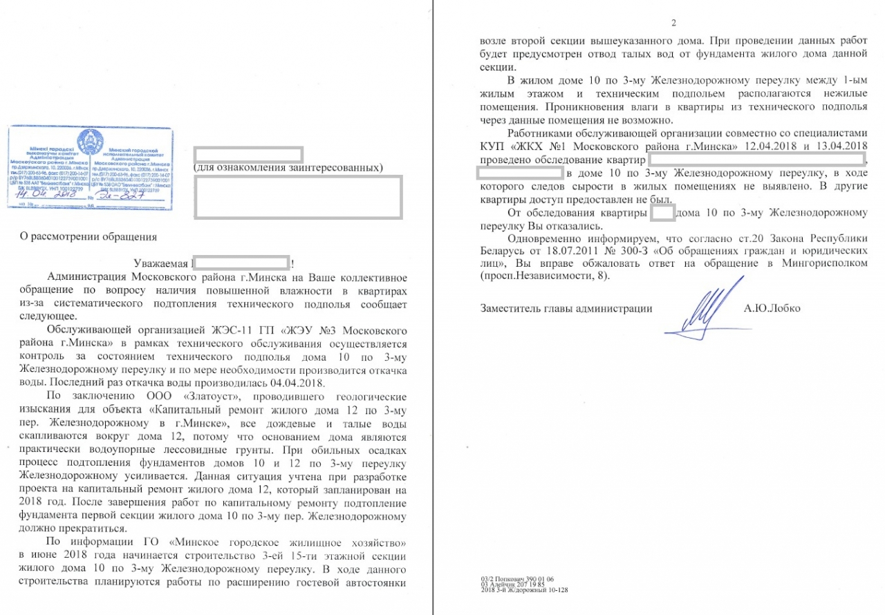 Н а протяжении последних двух лет подвал дома по адресу г.Минск, 3-й Железнодорожный переулок, дом 10 регулярно подтапливается. Уровень воды порой достигает от десяти сантиметров до полуметра и выше. Вода в подвале стоит и летом, и зимой, стоит по несколько дней, часто по несколько недель. Из-за стоящей воды в квартирах первого этажа возникает повышенная влажность, плесень на обоях, неприятные запахи. В теплое время года в воде заводятся комары. Все это создает благоприятную среду для распространения различных инфекций и заболеваний. А между тем, у некоторых жильцов есть маленькие дети. В подвале также находятся электрощитки, затопление может вызвать короткое замыкание в доме и порче электроприборов жильцов. Жильцы регулярно собственными силами откачивают воду из подвала. Неоднократно были направлены письма в Минское городское жилищное хозяйство и другие учреждения. Но результата это не дает уже на протяжении двух лет. Проблема как не решалась, так и не решается. При этом дом всё это время находится на гарантии, но бездействие властей и оттягивание решения проблемы сделает ее решение невозможным, что в скором времени приведет к аварийности нового дома. Жильцами регулярно оплачиваются счета, отдельными строками в которых значатся отчисления на капитальный ремонт и техническое обслуживание дома. В связи с этим требуем: