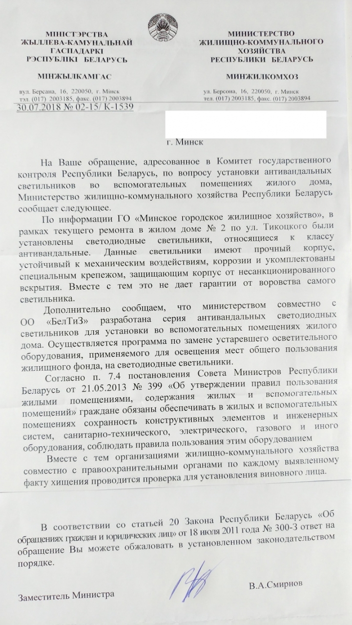 Это был всего лишь пример, подобная ситуация имеет место во многих подъездах по всей Беларуси и тянется уже долгие годы! В милицию обращаться абсолютно бесполезно, там лишь разведут руками: к каждой лампе по милиционеру не приставишь. Люди платят деньги за техобслуживание, система ЖКХ эти деньги всасывает как губка, а на выходе имеем лишь расточительное отношение к этим средствам. Смешно пенять на граждан, ворующих лампочки, их уже не исправишь, они были, есть и, к сожалению, будут. Но неужели руководство ЖКХ не в силах повлиять на ситуацию простой установкой антивандальных светильников? Ведь установить один антивандальный светодиодный светильник гораздо дешевле, чем раз за разом вкручивать новые лампы накаливания, которые потребляют много электроэнергии, и которые крадут через несколько дней после установки. И уж точно дешевле, чем неоднократно устанавливать простые светодиодные светильники, которые выкручиваются отверткой за несколько секунд! Огромные деньги попросту разбазариваются!